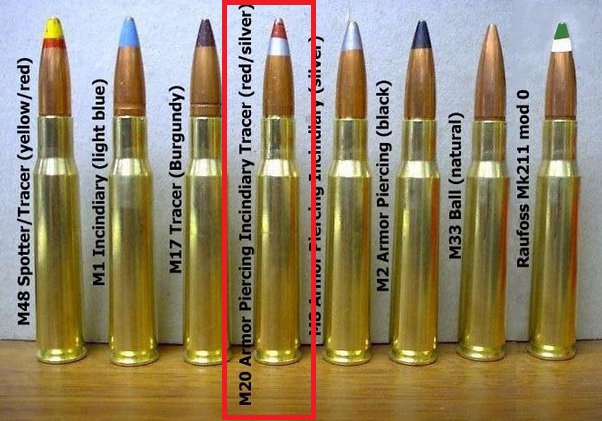 Пуля M.20 APIT(бронебойно-зажигательно-трассирующая) скорее всего от .50 cal BMG(12,7x 99 Browning), но возможно и 12,7х108 ДШК боснийского производства фирмы Игман Кониц(первые поставки патронов BZT44 APIT с такой цветовой маркировкой были в 2022г.)