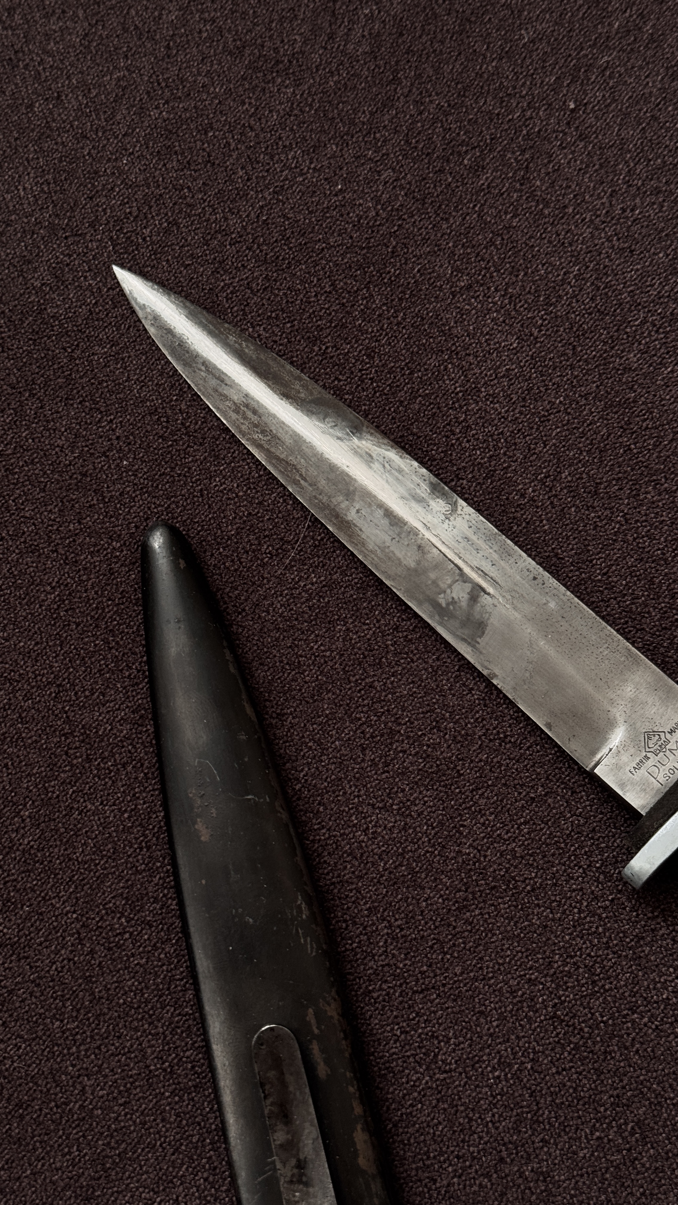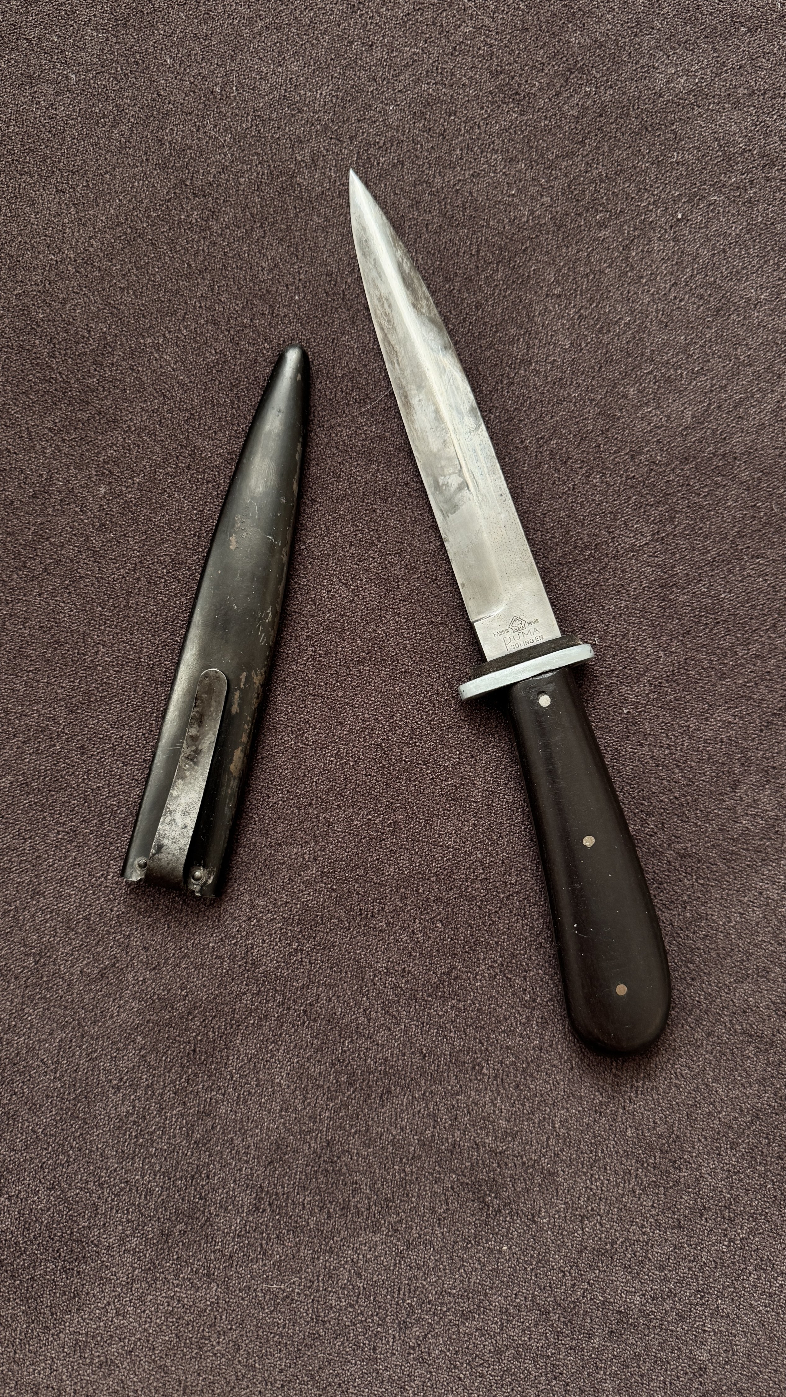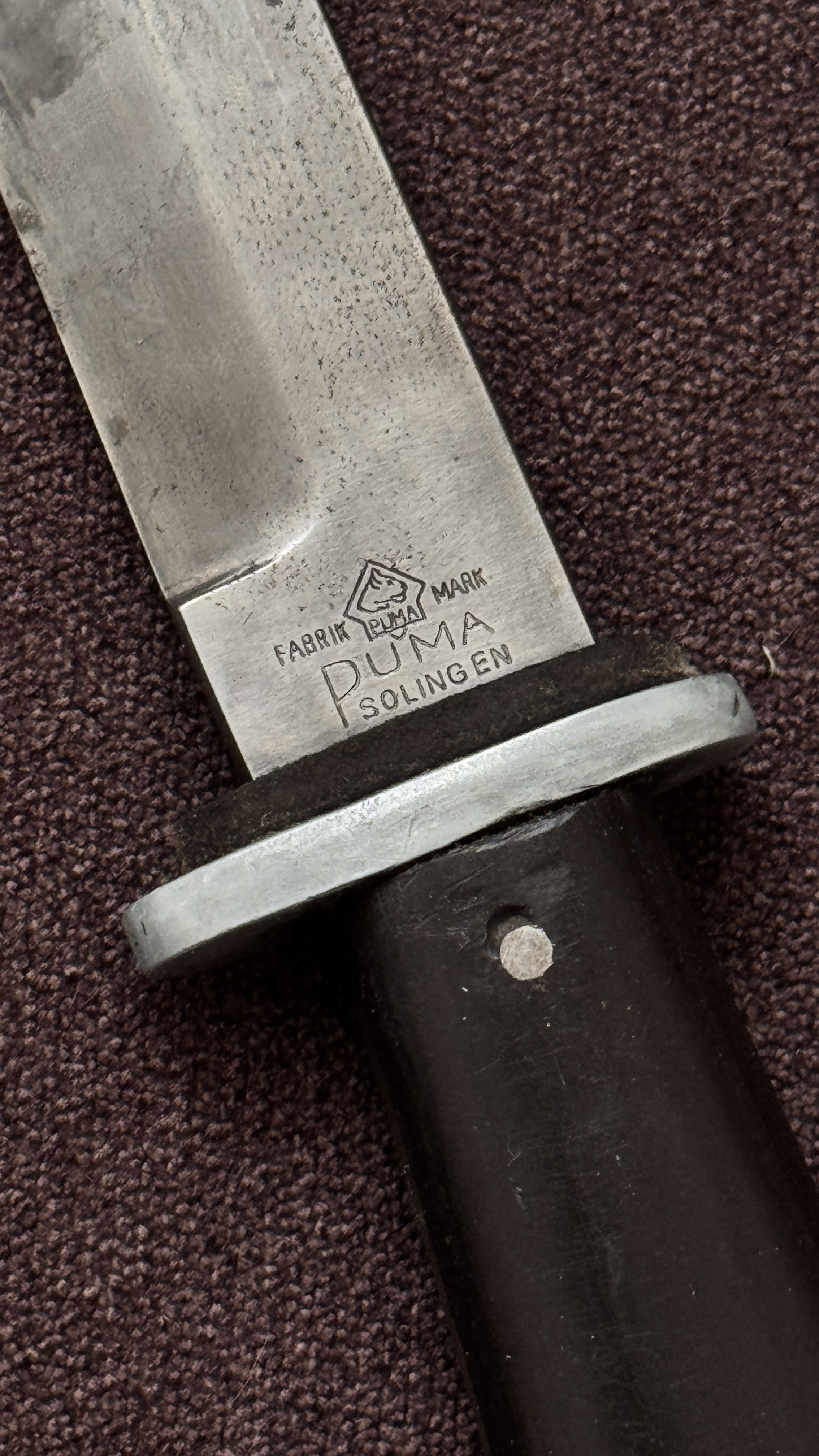 Меня смущает проработка клейма (голова пумы, некоторые буквы), щёчки под вопросом (лишние отверстия, материал), крестовина... Взял три доступные Пумы этой же модели (с клинком полуторной заточки и цинковой крестовиной) для сравнения клейм. Сабж в коллаже первый.