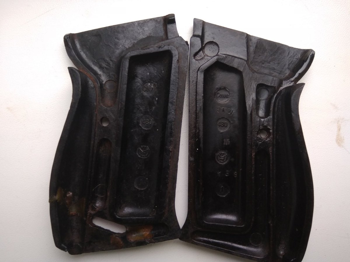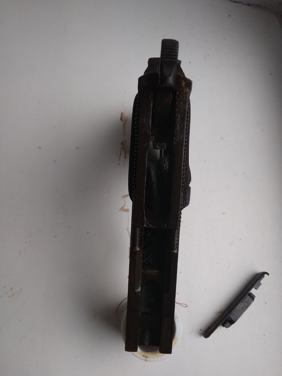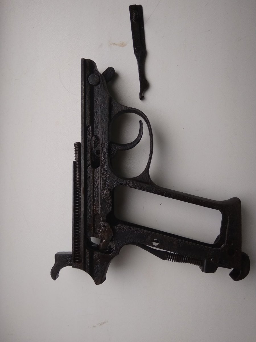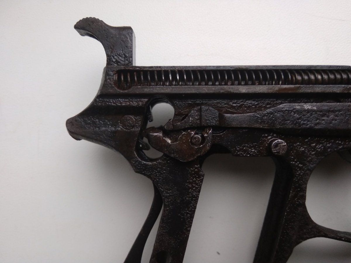 Вот нашелся такой пистолет. Не взводится, Спуск не работает, магазина нет. Сломано шептало, флажок предохранителя, нет целика и выбрасывателя из надписей чуток просматривается пару цифр. Думаю что то послевоенное...
