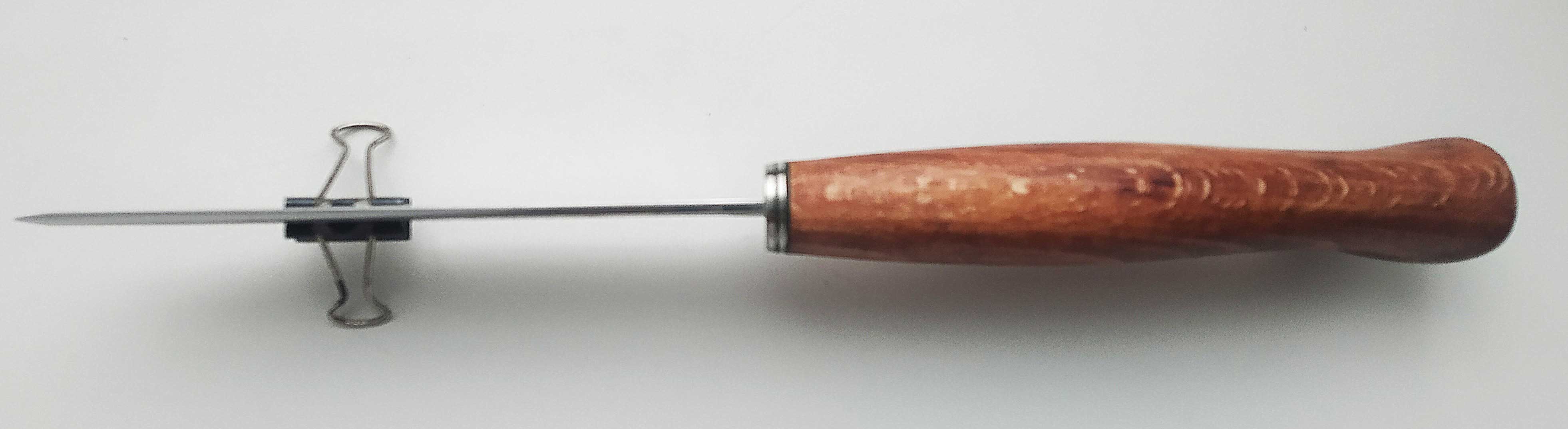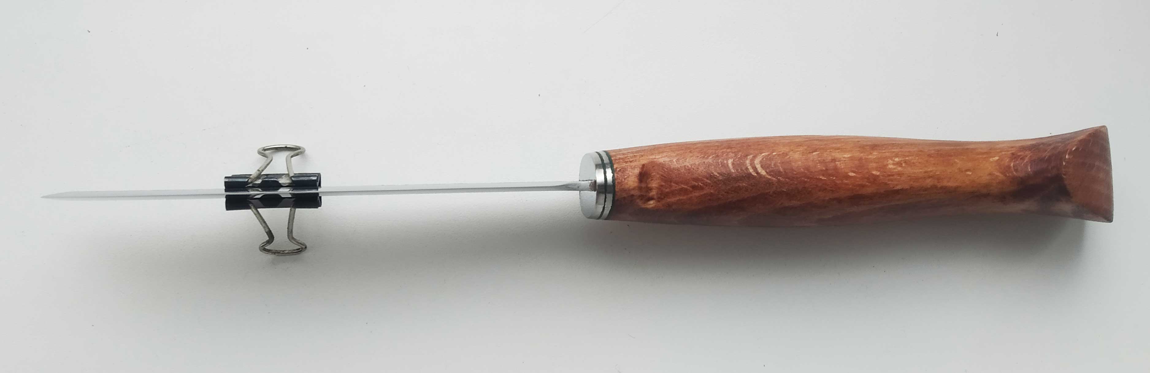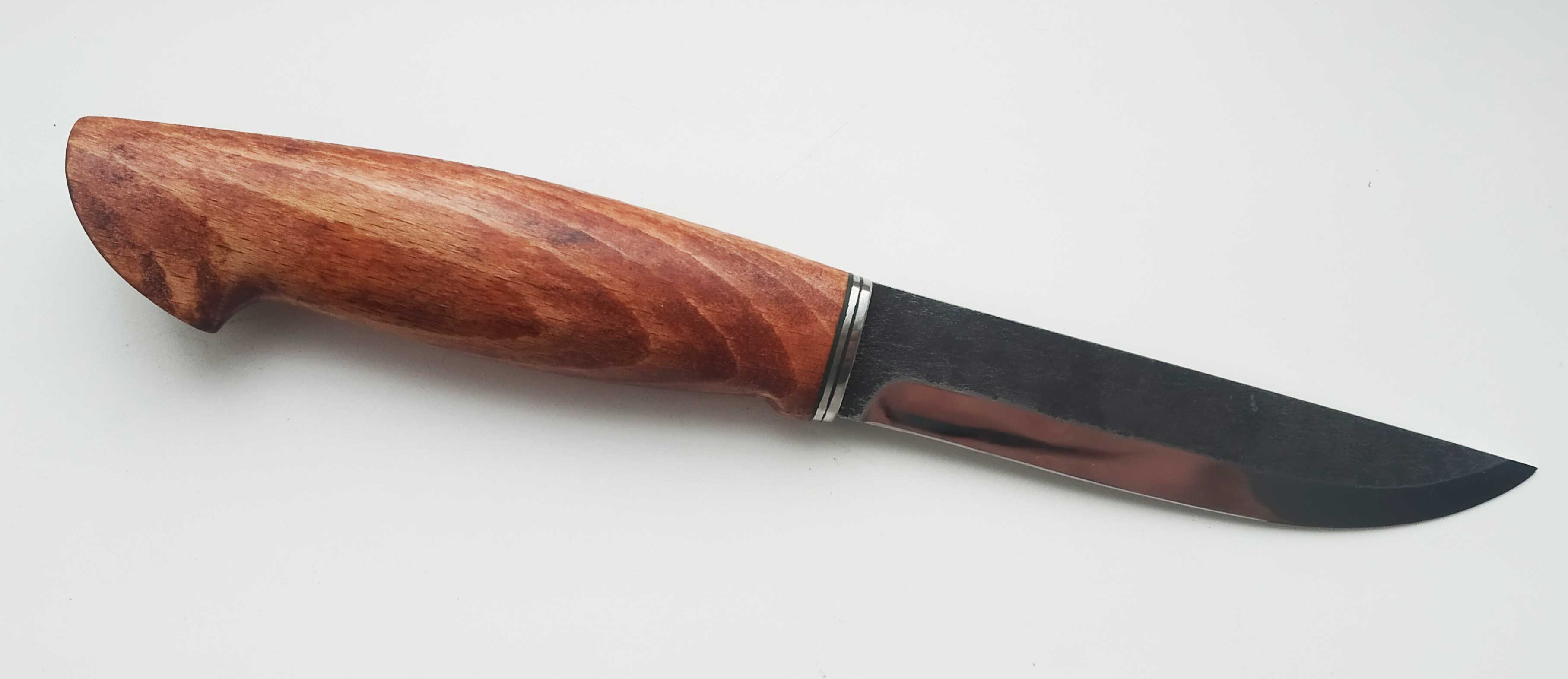 Сталь Р6М5, бывшая пила по металлу толщина в обухе 2,1 мм , длинна клинка 117 мм, длинна рукояти 125 мм, ширина клинка 23 мм, больстер из нержавейки 2 мм и зеленной фибры, рукоять тонированный бук. Материал клинка ржавеющий. Ножен нет. Цена 1100 гривен.