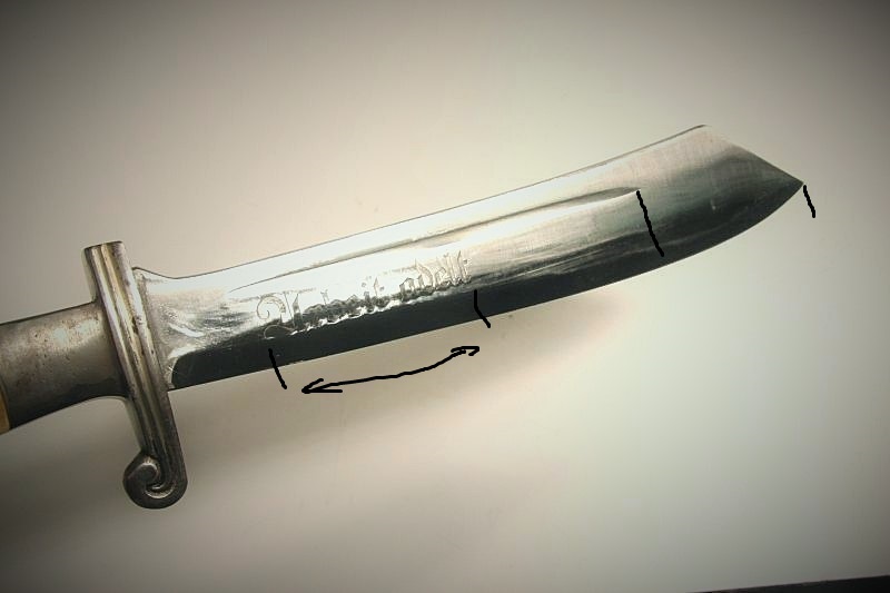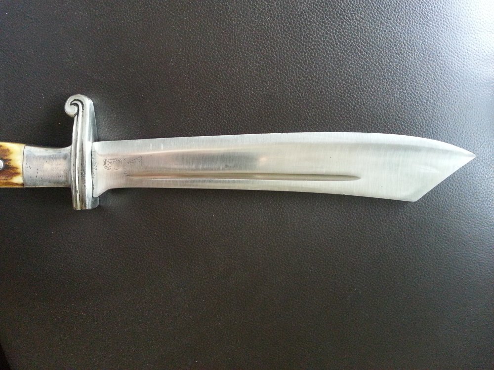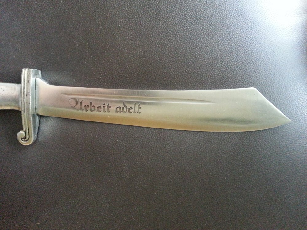 Ну вот я и стал обладателем сего, предмета))) Сделал новые фото.(тел) но видно на них лучше. Обсуждать конечно нечего. Но прошу посмотреть, так сказать для обмена опытом. Спуски могли бы быть лучше. Девиз заворонил химией ( хуже уже не будет). Легенда кинжал из Южной Америки куда была продана партия для рубки сахарного тростника после войны))