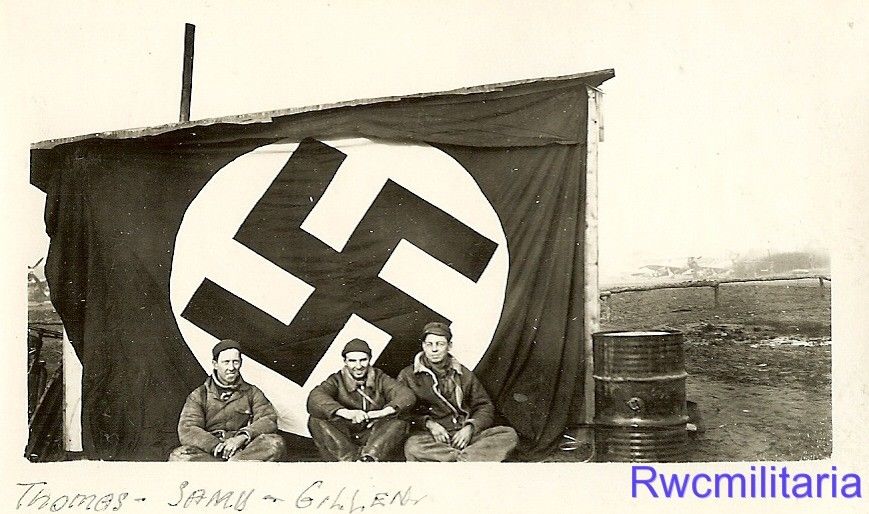1) SALUTING US Airman Posed in Front of Large Captured German Flag 2) Trio US Airmen with Captured German Flag on Airfield by P-47 Fighters