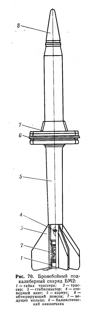 "...Остроголовый корпус снаряда выполнен из высокопрочной стали. На головной части корпуса специальным припоем закреплен бронебойный наконечник. Выполненный из более пластичной стали, чем корпус снаряда, бронебойный наконечник служит для предохранения корпуса от разрушения в момент встречи снаряда с преградой. Благодаря своей форме, наконечник позволяет улучшить условия встречи снаряда с преградой и уменьшить возможность его рикошетирования при углах встречи менее 90 градусов. Для улучшения аэродинамических свойств, на бронебойный наконечник надет баллистический наконечник, изготовленный из листовой стали, и закрепленный при помощи закатки в две кольцевые канавки бронебойного наконечника. Для предотвращения проворачивания баллистического наконечника относительно бронебойного наконечника, на последнем имеется накатка накатка..."