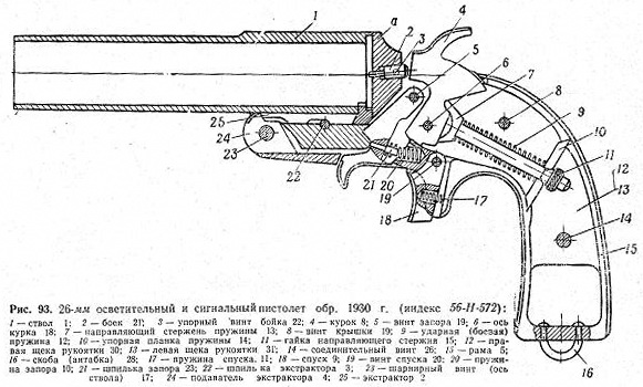 Первая серийная ракетница СССР - СП ( ОП ) 26 . Фото. разобранной для наглядности ( видны явные отличия от ОСП 30). Существует два вида этой ракетницы.
