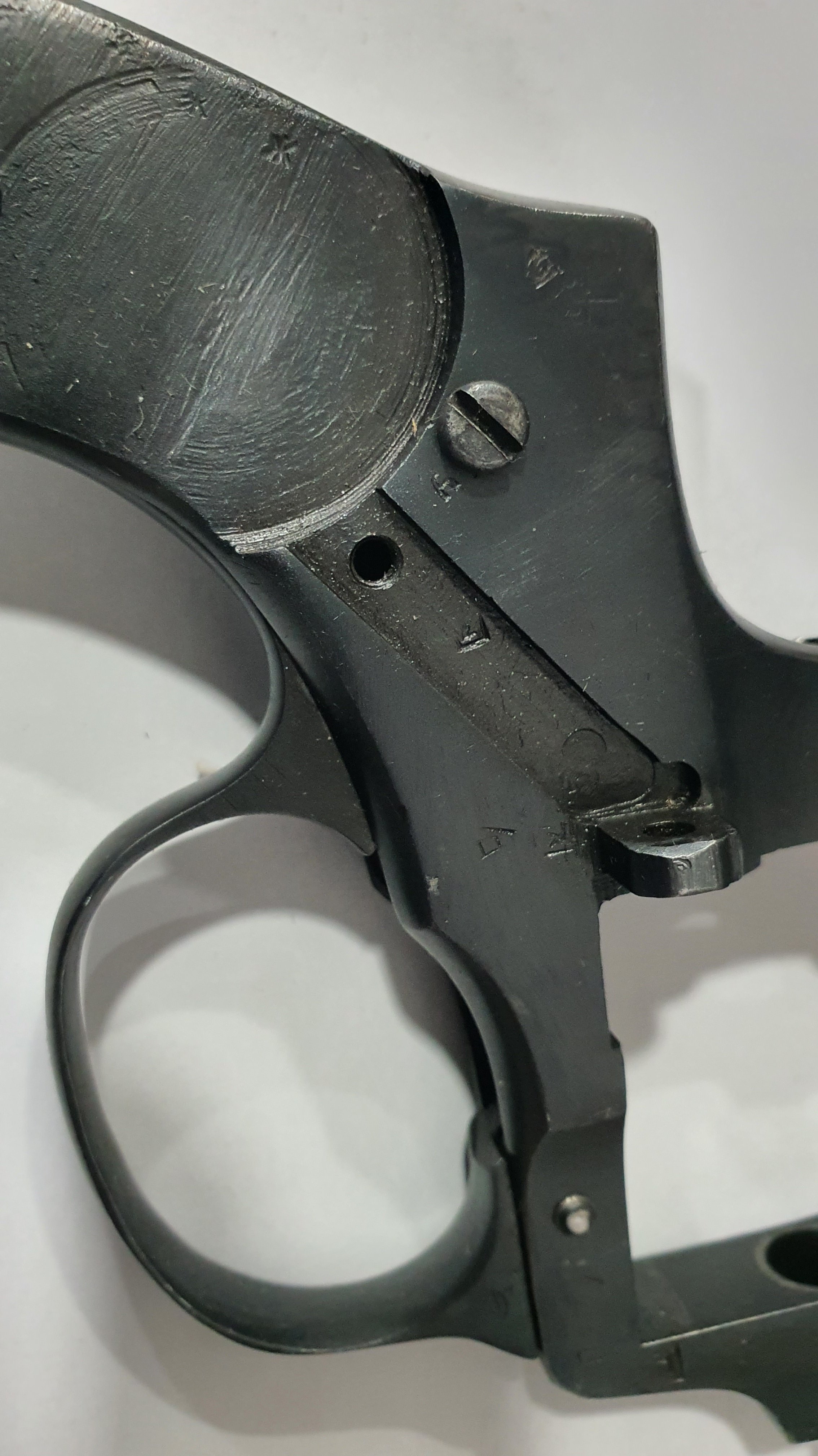 Доброго времени суток! Прошу форумчан подсказать по стоимости на настоящее время рамки револьвера системы Наган. Рамка с ммг револьвера о чем сведетельствуют представленные фото. Верхнее отверстие от штифта крепление стволика восстановлено. Пригодна для разных экспериментов (комплектация до состояния схп и т.д.....) С Ув.