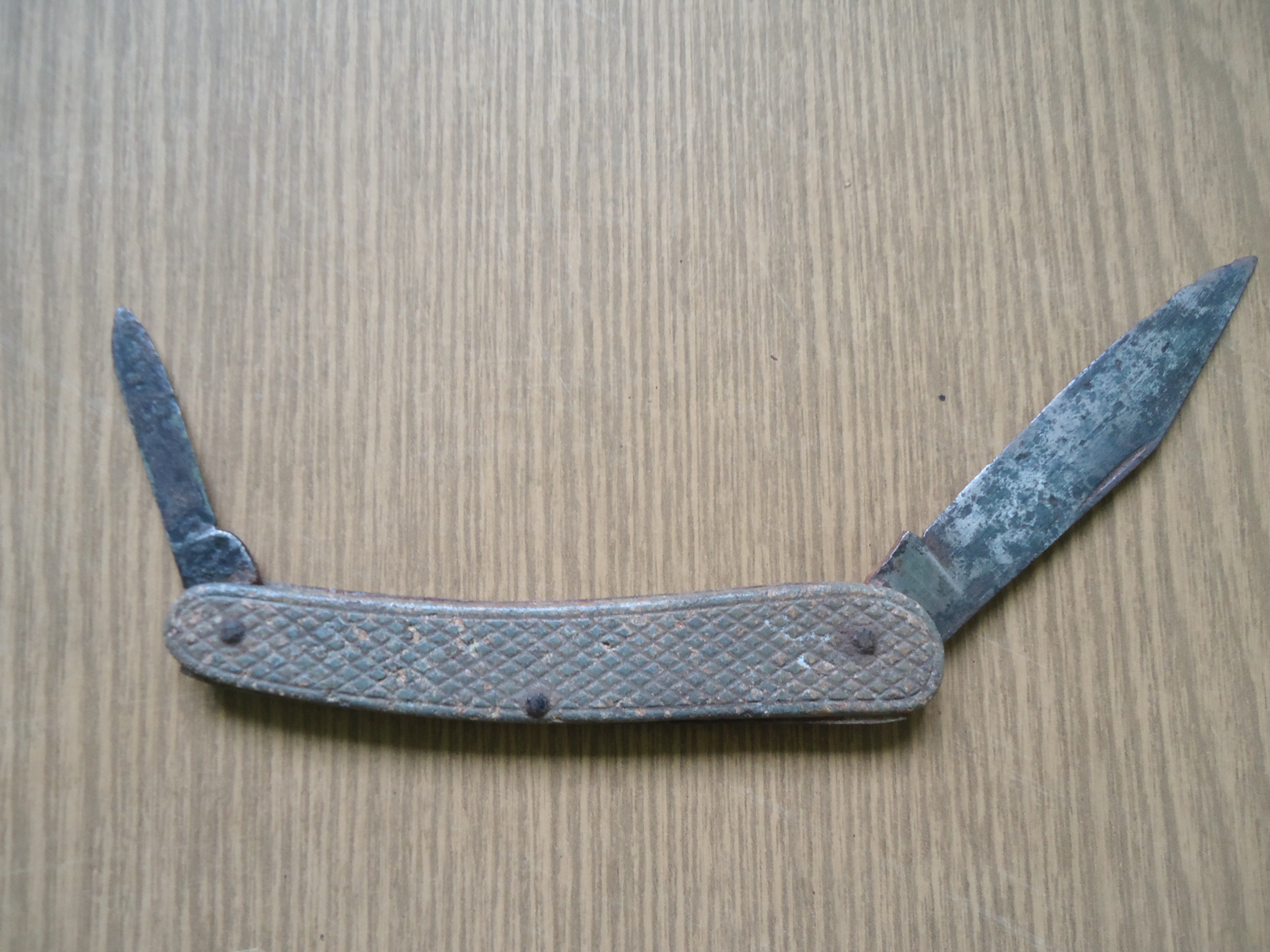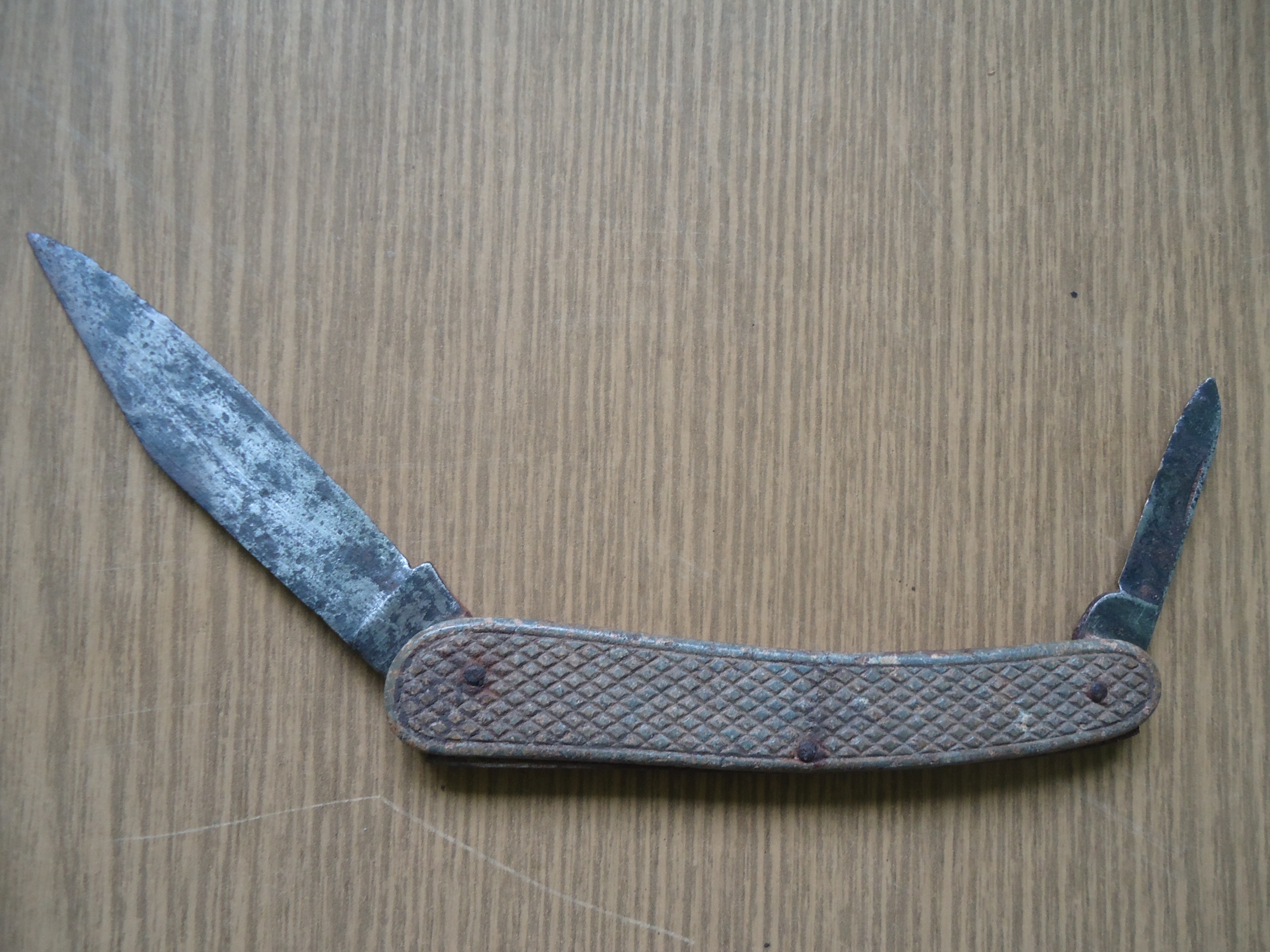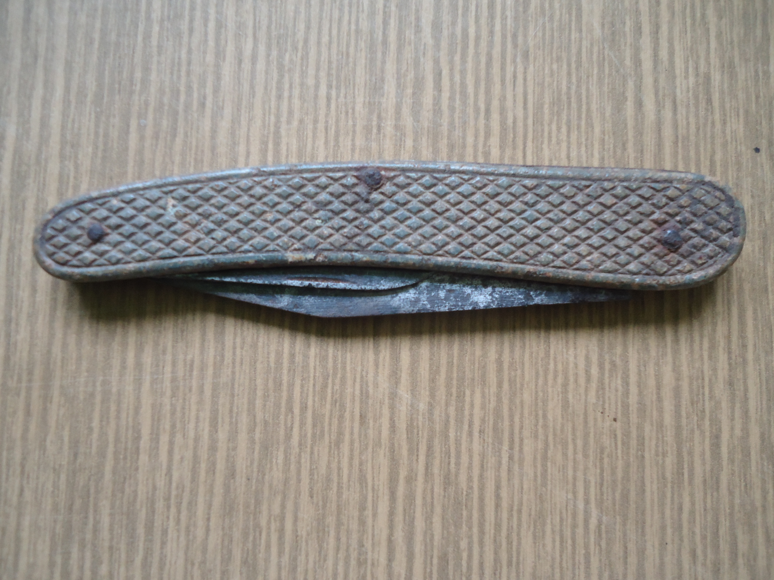 Добрый день.Вот такой ножик был найден на позициях.При чистки клейм не обнаружено. Накладки цинк.Как вы думаете это нож тех времен или поздняя потеряшка.