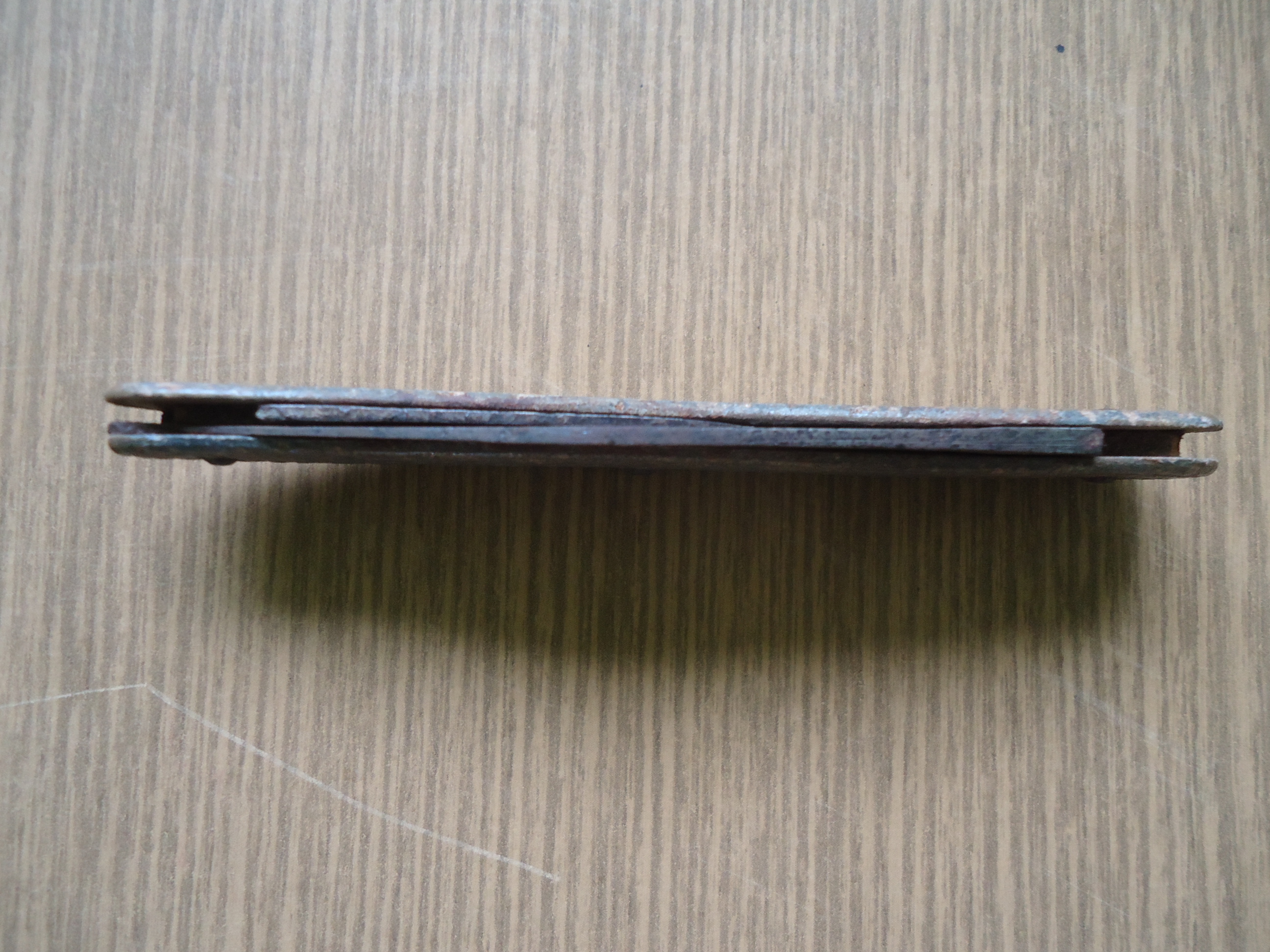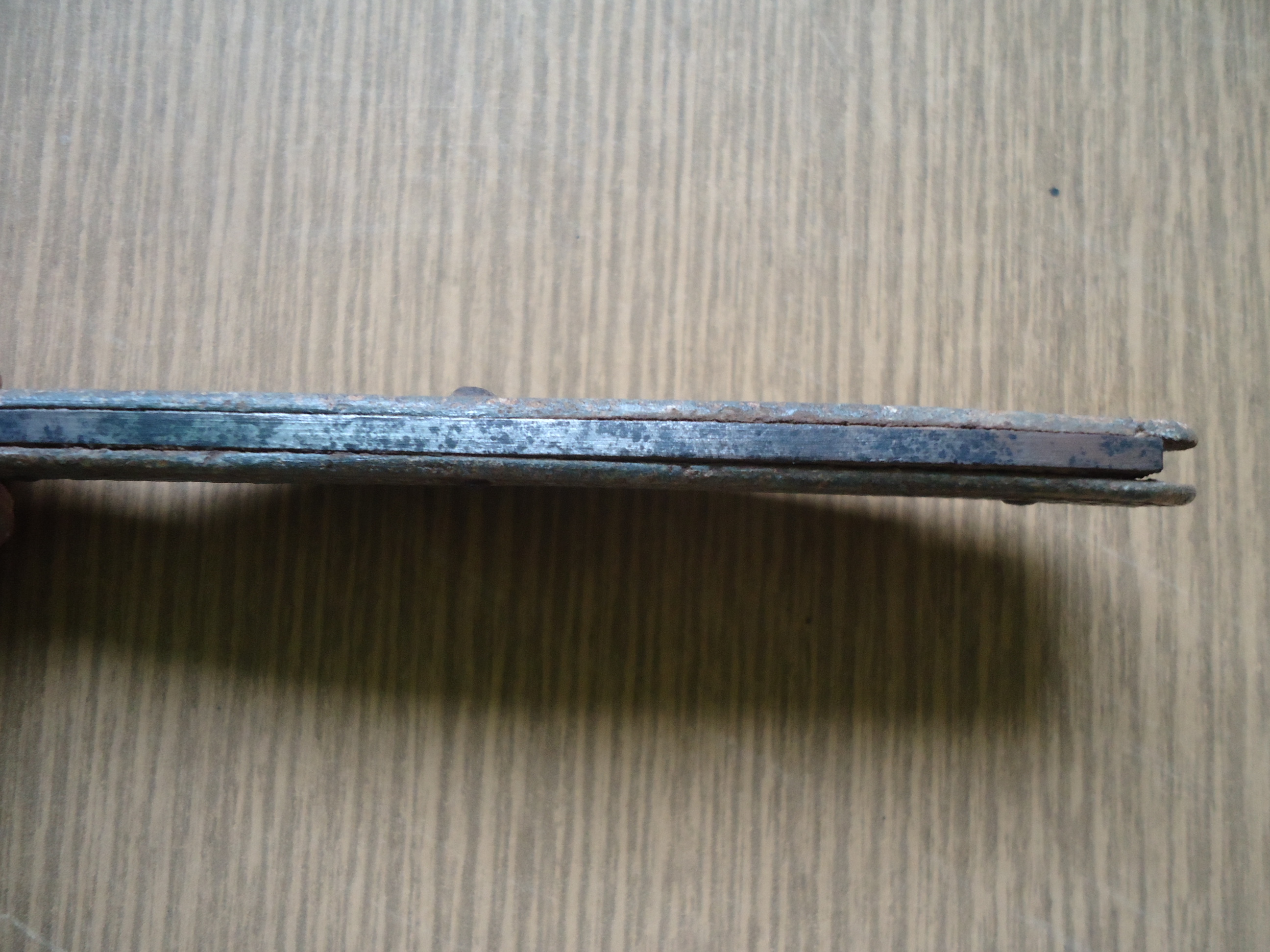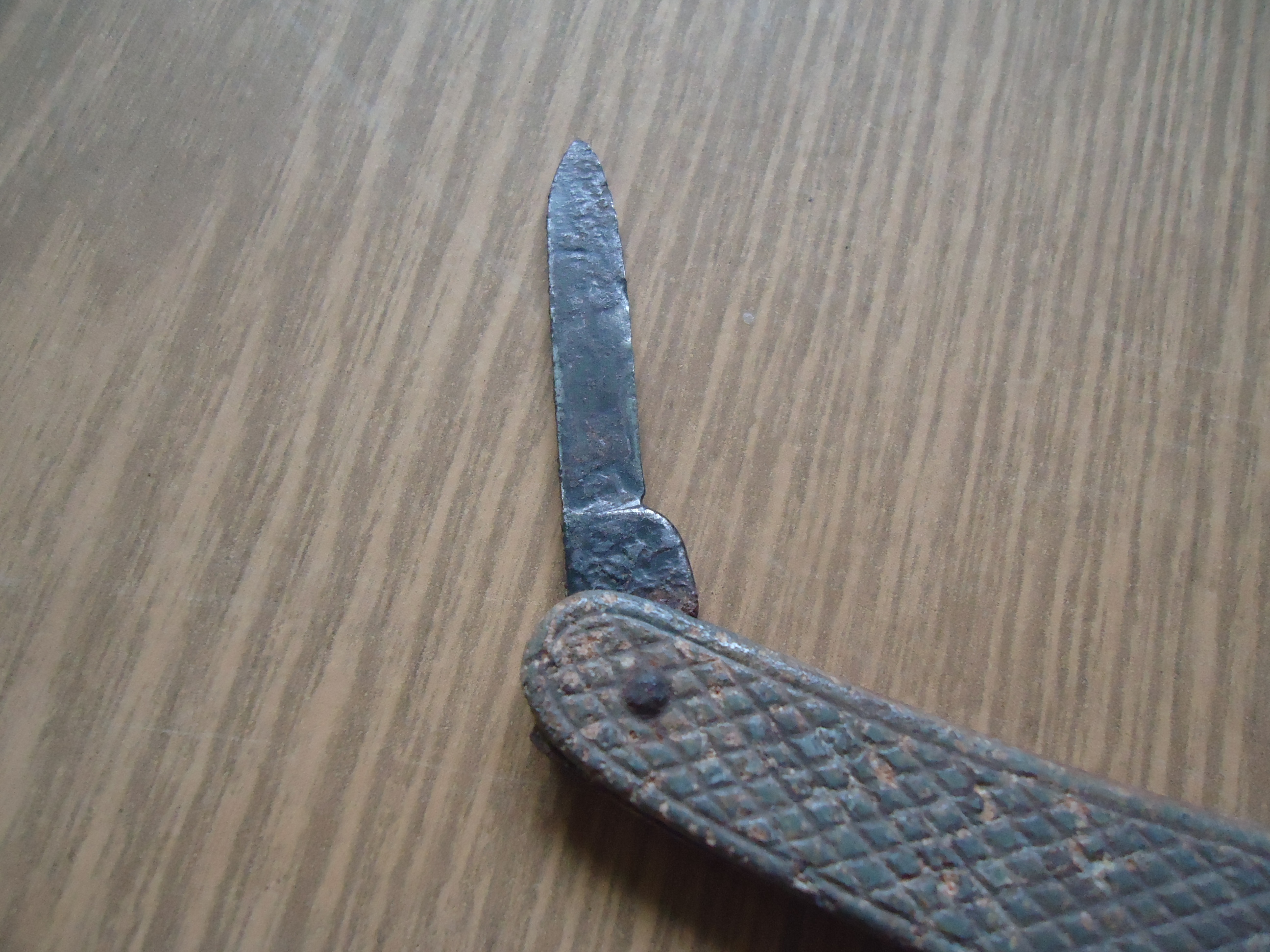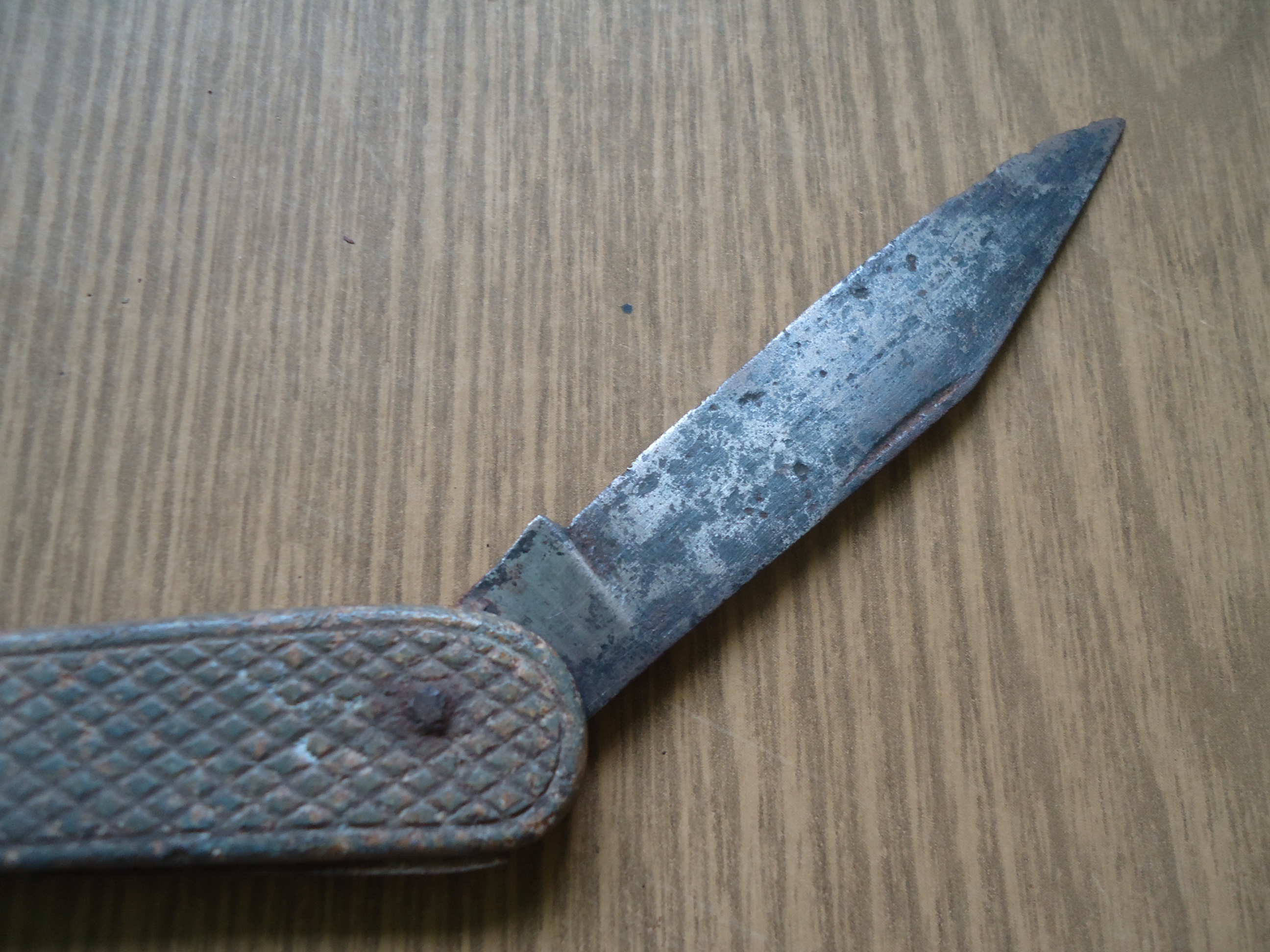 Добрый день.Вот такой ножик был найден на позициях.При чистки клейм не обнаружено. Накладки цинк.Как вы думаете это нож тех времен или поздняя потеряшка.