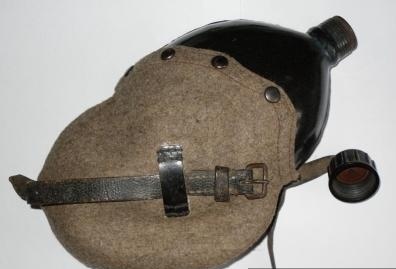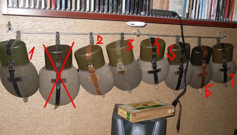 8 - 110 уе (Фляга вермахтовая в редкой сине-чёрной эмали. Исключительно для гурманов! Чехол поздний без клейм. В отличном состоянии. Без дыр, надрывов и т.п. Колба со сколами эмали, без клейм. Обвес поздний двусоставной, леченый. Оригинальный бакелитовый стаканчик , клеймён 44-м годом.) 9 - 300 уе (Одна из самых поздних моделей, изюминкой которой является самый поздний стаканчик в коричневой эмали и без ручек, колба синяя. Без клейм)