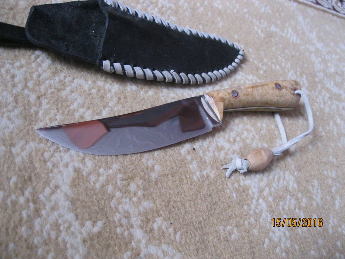 разделочный нож,под турецкий.сталь-тарелка тепловозного клапана(выпускной)лезвие 125*29 мм,толщина конус(на конце рукояти 3 мм,на носике 1 мм)спуски прямые,на 0 мм.рукоять кап клёна,ножны-кожа,подвес свободный.общая длина ножа-230 мм. 500 гр.