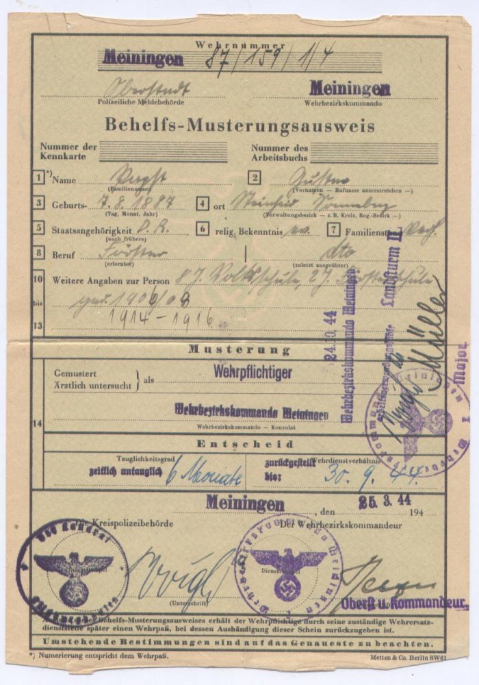 1 Удостоверение помощника государственного адвоката 2 Удостоверение о дополнительном освидетельствованием. 3 Положения... 4 Свидетельство о смерти 5 Освидетельствование для Вермахта 6 Свидетельство за служебную пригодность. 7 Свидетельство окружного руководителя NSDAP.