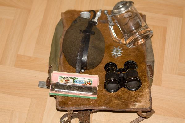 1 Рюкзак волосатый 1936 г- 85euro 2 фляга с номером, 1940г- 35 euro 3 эдельвейс на кепку - 75euro 4 бинокль .первая мировая- 45 euro 5 Пивная кружка, стекло - резерв 6 гармоника - 35 euro 7 карточная игра "elfer raus" 1933-1945 - 15 euro