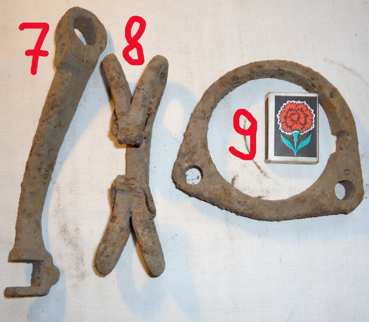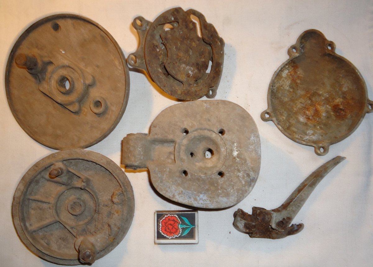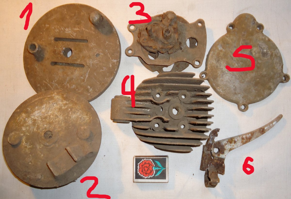 да после военные. №1 это передний апорник мотоцикла"восход-2" или "восход 2м" №2 тоже апорник с мопеда "верховина","карпаты","рига".№4 головка мопеда "верховина-3".№5 и №6 от мотовелосипеда типа "зиф","львов","рига". №3 кулиса кпп с с какой техники не знаю,но судя по прорезам кпп четырехступенчатая. в первом посте кажется куча железок это крепеж от советских лыж.