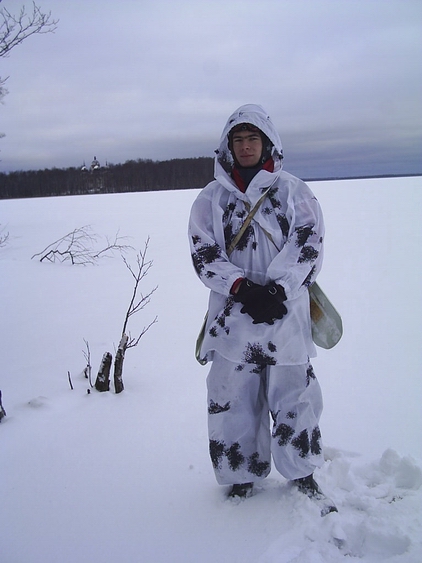 Погуляв по монастырю и окрестностям, решаем перекусить- т.к. крайний раз мы ели ещё перед поездом-почти сутки назад. Обедать решаем в беседке на берегу озера, прям за монастырём. За обедом обсуждаем дальнейший план операции -у нас конечно есть палатка,но там что-то не работает-вроде молнии, да и перед экспедицией её не проверяли, а пользоваться давали и друзьям на рыбалку, и родственникам на охоту, и соседям на дачу… Вобщем во время обеда открыли рюкзак мой и поглядели на палатку-она была без видимых повреждений, вроде даже всё в наличии, всё так же не работали молнии….вот только смущали стойки-у меня были подозрения, что это стойки от другой палатки, да и вообще их некомплект. Переглянувшись и пропустив ещё по 150 решаем что палатка на крайний случай, а делать будем так как задумали. А задумали мы просто-перед поездкой консультировались с мужичком-который лет 20 назад часто бывал в этих краях-он на карте отметил нам все здешние избушки. Мы несказанно благодарны ему за это. Почти всё оказалось так как он говорил. За всё время экспедиции мы нашли три, из шести указанных изб, одну не нашли вообще-даже остатков (может плохо искали),а остальные две даже и не пытались искать. Вобщем решаем что ночевать на улице мы не хотим, и поэтому выдвигаемся к первой избе- которая находиться прям напротив монастыря, на другом берегу озера. Время около 14-30,всё так же пасмурно, лёгкий снежок, умеренный ветер, небольшая позёмка. Шустро пересекаем озеро. С обоих сторон у берега наши следы заполняются водой, но проверка показывает лёд такой же толстый, как в середине,просто наверху у берега под снегом прослойка воды. Переходим озеро за 15 минут и около 40 минут ищем избу. Находим логово бобров (точно не знаю как оно называется- вроде хата?), а вот избы не наблюдаем. Решаем двигаться к другой ближайшей избе-выдвигаемся. Время приближаеться к 16-00, мы переходим на другую часть озера (если можно так сказать-озеро состоит как бы из двух заливов), и начинаем искать другую избу, которая должна быть на берегу ручья… Уже темнеет- в сумраке с середины озера виднееться нечто-понимаем, если ломанёмся на берег, не сможем выйти на место где стоим сейчас, не ломанёмся сейчас-через 20 минут не увидим и этого места… Решаем что чем чёрт не шутит-берём курс на тень на берегу. Через 20 минут, почти в полной темноте упираемся в избушку. Время 17-15. Избушка конечно так себе-одни широкие нары, низковата, печка с дырявой трубой. Но всё же избушка, и дверь есть. Начинаем готовить ужин, делаем чай, и обсуждаем план на завтра. Мы находимся в невыгодном месте-до нашей цели (а кто не в курсе это Юнкерс 88) отсюда довольно далеко, и что главное неудобно добираться. Поэтому решаем завтра утром искать другие избы, более для нас подходящие…Опрокидываем по паре наркомовских, и засыпаем тревожным сном. 30 декабря. Утром около 7.00 мы уже на ногах. Ночь прошла спокойно. Хорошие профессиональные спальники не дали нам замёрзнуть, даже было немного жарко. Быстро делаем чай, перекусываем, собираем рюкзаки и готовимся покинуть избушку, как только рассветёт. Рассвет в 9.00. Выдвинулись. Рюкзаки решаем пока отставить в избе на чердаке. Комрад по привычке минирует наши вещи и избу… Разрабатываем метод поиска ненайденной вчерашней избы, проходим с одной части озера на другую по суше-если глянуть карту, будет понятно о чём я говорю… 