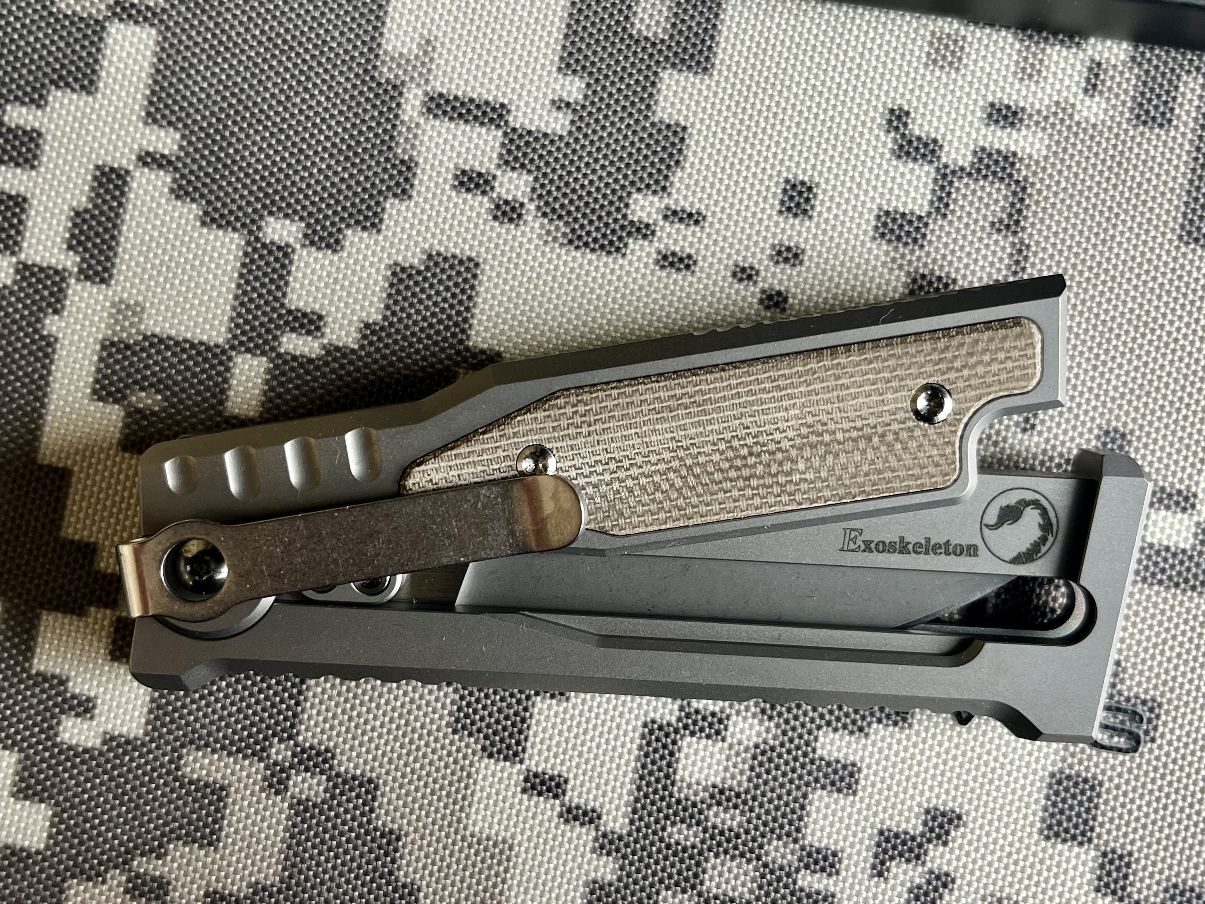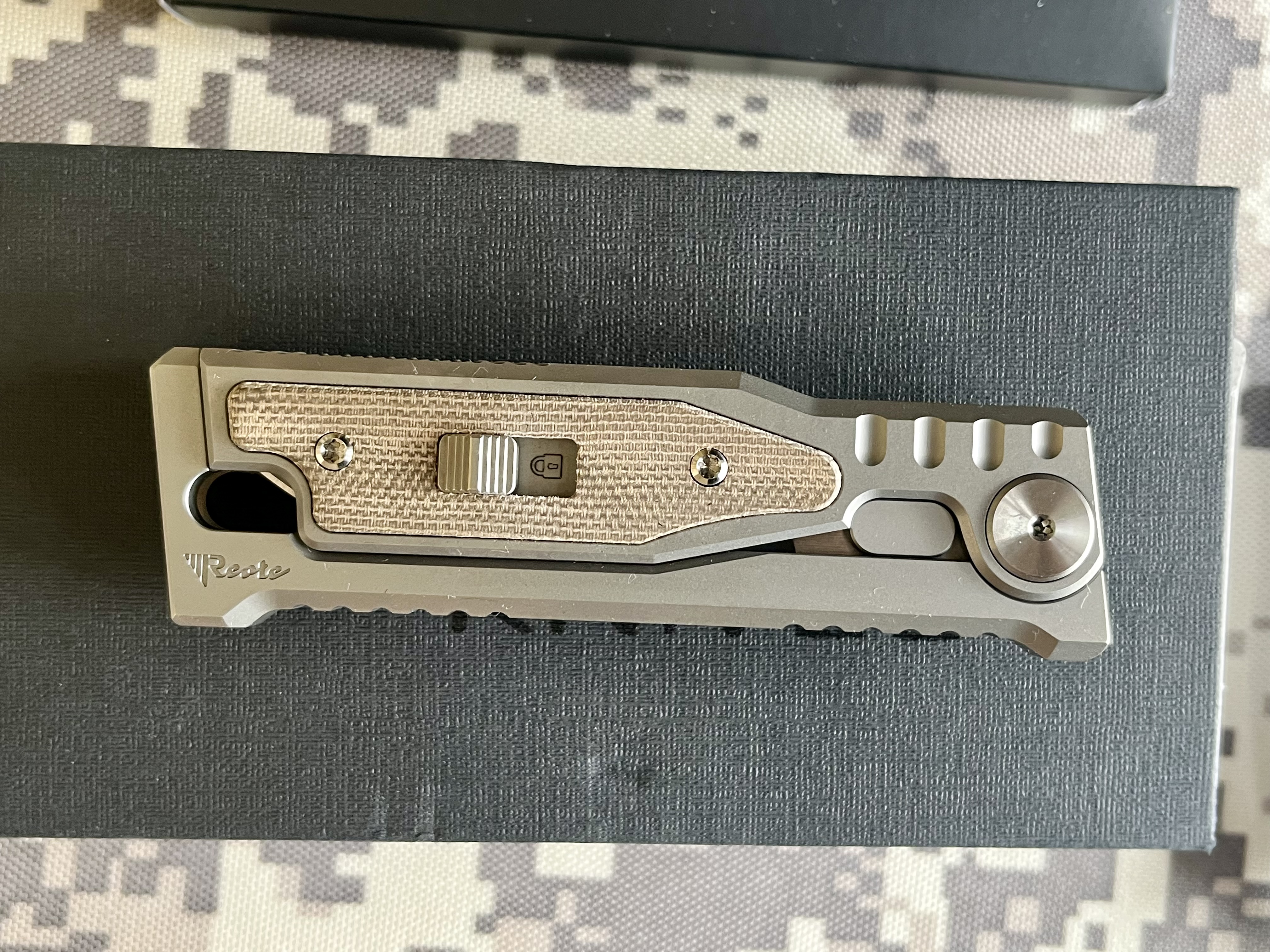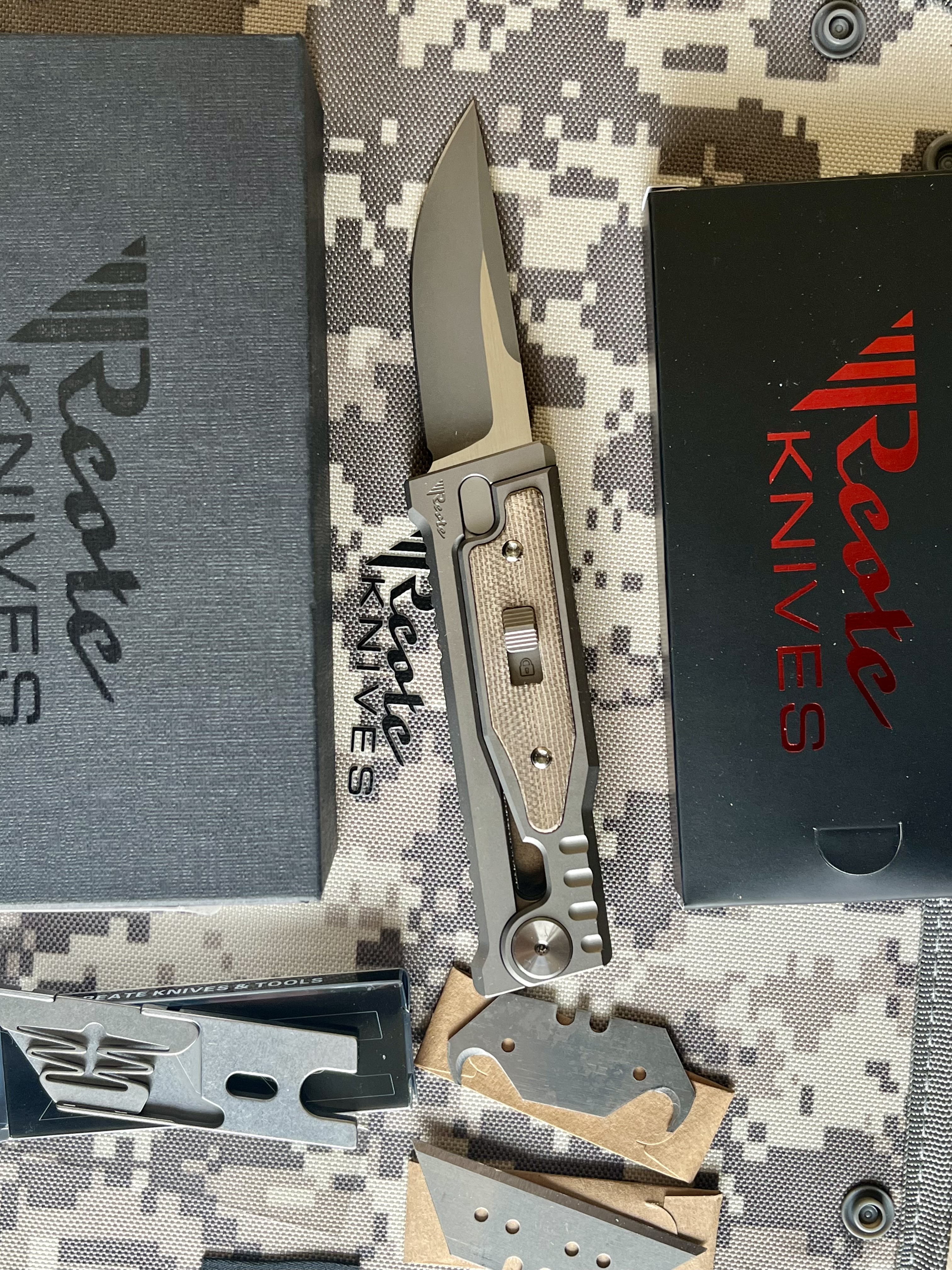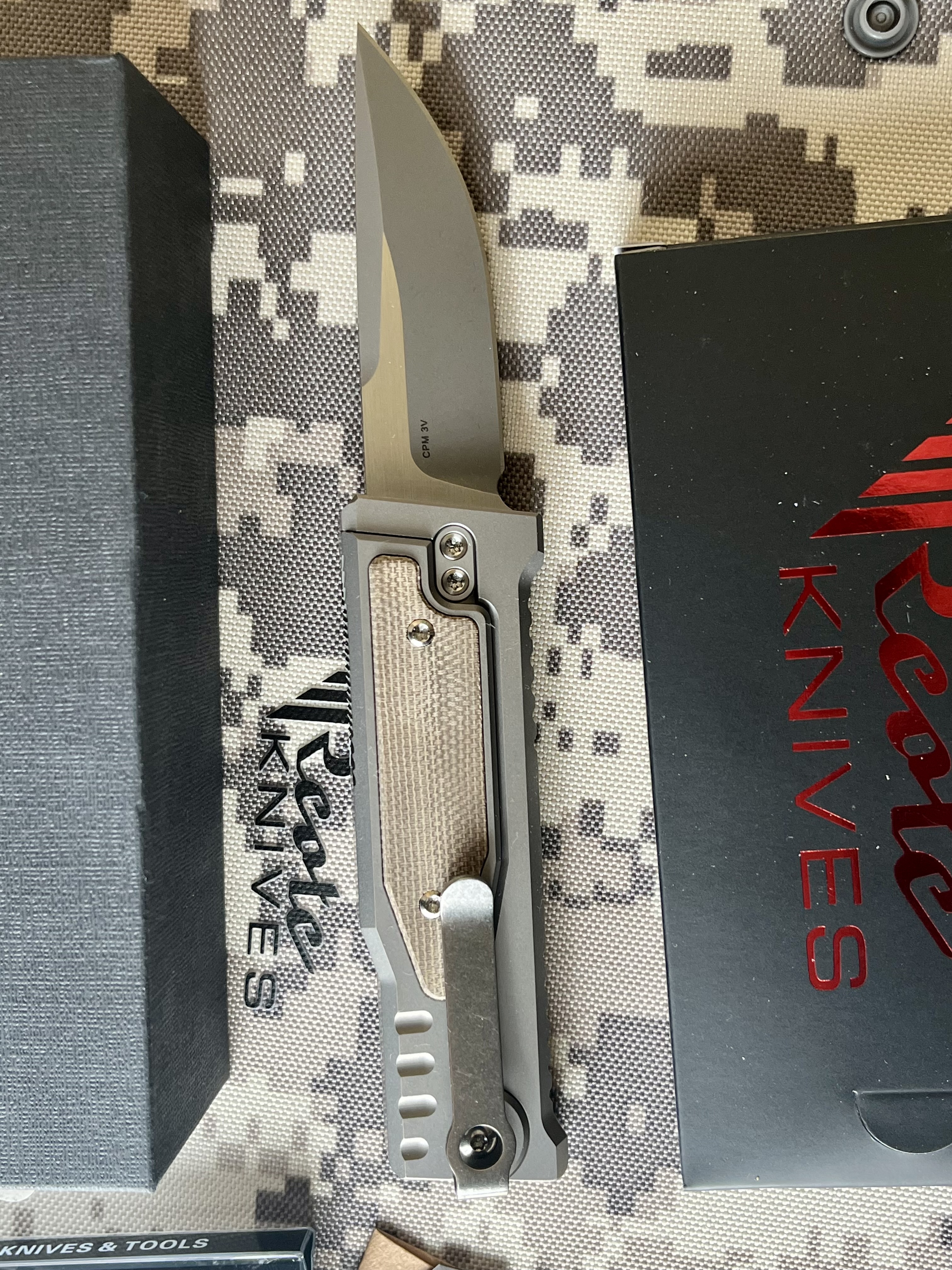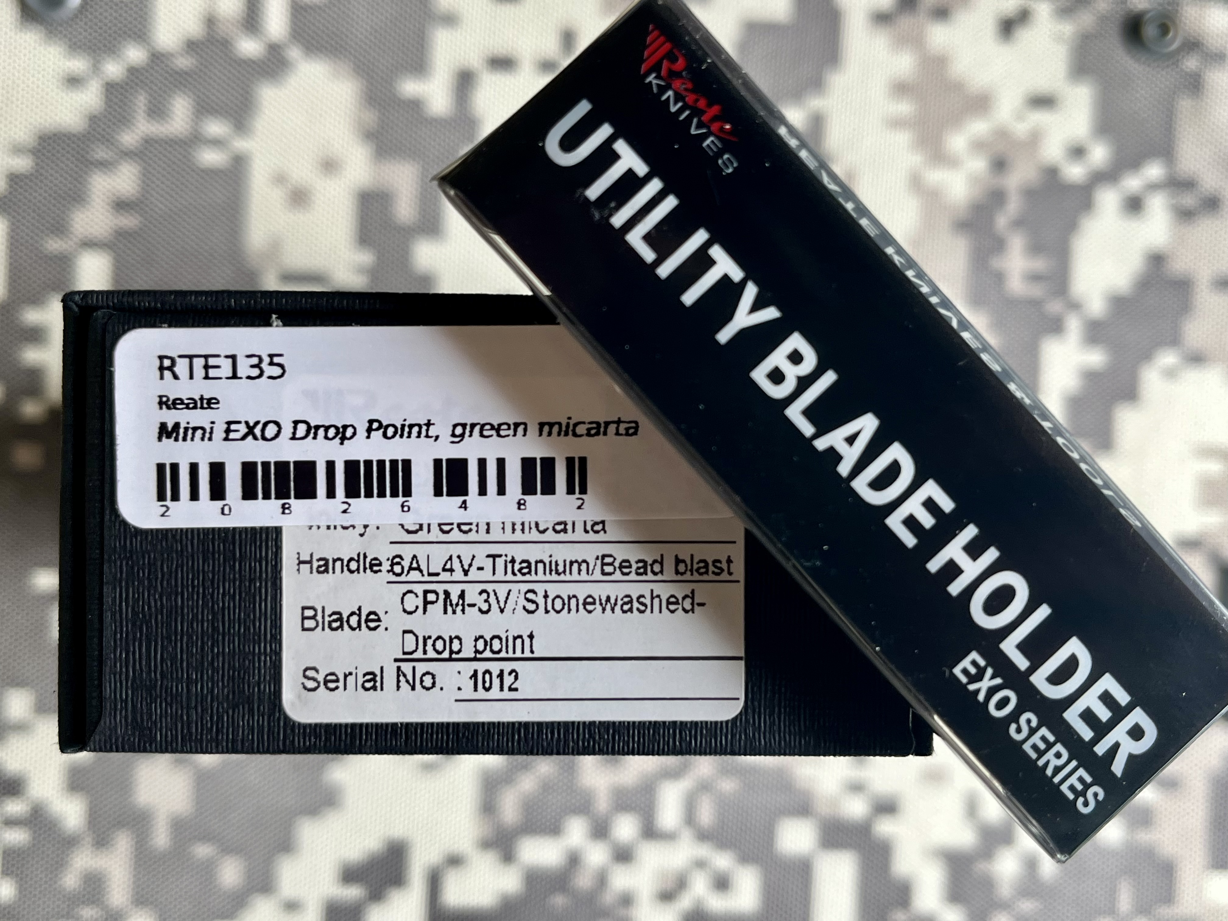 Reate Mini EXO Drop Point, green micarta • Сталь: CPM 3V • Закалка: HRC 59-61 • Отделка клинка: satin + stonewash • Корпус: Титан + Micarta • Вес: 108 г • Длина общая: 165 мм • Длина клинка: 64 мм • Длина рукояти: 94 мм • Толщина клинка: 3 мм Бонус: адаптер для трапецевидных лезвий + 2 лезвия Новый. Цена – 8400 грн