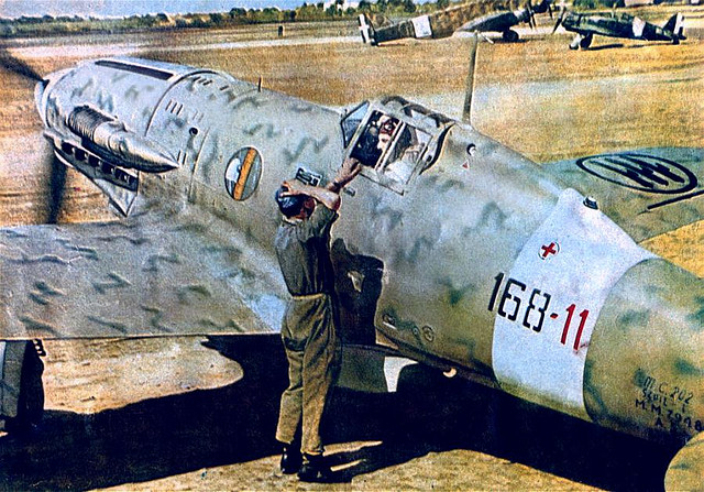 Теперь... Где это могло быть и когда? Итальянцы пишут(на предыдущем фото), что это было на одном из украинских аэродромов. В одной из книг, как видите , нашел, что это было на аэродроме Сальц в Румынии в сентябре 1941г. Фото - это скан из книги, очень плохонькое, но место съемки очень похоже на место съемки на предыдущих фото. В общем же известно, что Avaizione del CSIR было сформировано на румынском аэродроме Тудора(Tudora) в 80 км. северо-западнее г. Яссы. И 22-я автономная группа и 61-я автономная группа добиралась в Кривой Рог через Тудору в августе. Реально предположить, что и Sezione Volo Fotocinematografica так же летели через Тудору. Может эти снимки румын и итальянцев сделаны в Тудоре? Есть еще фото где эскадрильи 22-ой группы выстроены на аэродроме в Бухаресте. Но это было перед Тудорой, не думаю, что бы на аэродроме в Бухаресте были такие кусты и заросли как на предыдущих фото, в которых прятали бы МС 200. Наверняка эти фото, о которых мы говорим, выполнены на полевом аэродроме. Немного о дате съемки. Если истребитель Русполи в сентябре 1941 года был только в Румынии на пути к Русскому фронту, то как 27 августа 1941 года Русполи мог сбить два И-16 в одном бою в районе Кривого Рога? Есть изложение боевой работы Avaizione del CSIR по дням вылетов, фамилии летчиков участвующих в вылете, номера эскадрилий к которым они принадлежали, характер боевого задания и т.д. Но поскольку Sezione Volo Fotocinematografica входило в Avaizione del CSIR формально, а подчинялось напрямую Stato Maggiore, то результаты работы Sezione в изложении не фиксировались. По тому когда провел Русполи свой бой, отснятый на фотоплёнку и когда сел на вынужденную пока точно установить не пришлось. Итальянцы пишут, что это произошло 27 августа, может быть, а может быть и позже в сентябре. Но судя по листве на деревьях рядом с разобранным МС -200, не позже сентября. Sezione Volo Fotocinematografica было на Русском фронте до ноября 1941 года. В боевом расписании итальянской авиации в России на 1942 год такого подразделения уже не было. Соответственно фронт покинул и единственный Cant. Z.1007-bis. В июне 1942 года Русполи возглавил 91-ю эскадрилью 4-го Стормо с истребителями МС-202 и участвовал в боях в Северной Африке. 17 июля на МС -202 ММ7844 с бортовым номером "91-3" и неизменной кинокамерой одержал первую победу в Африке сбив "Харрикейн".