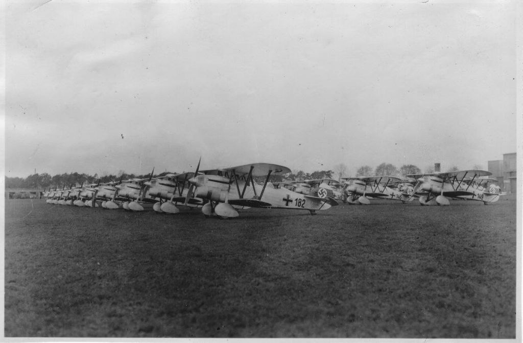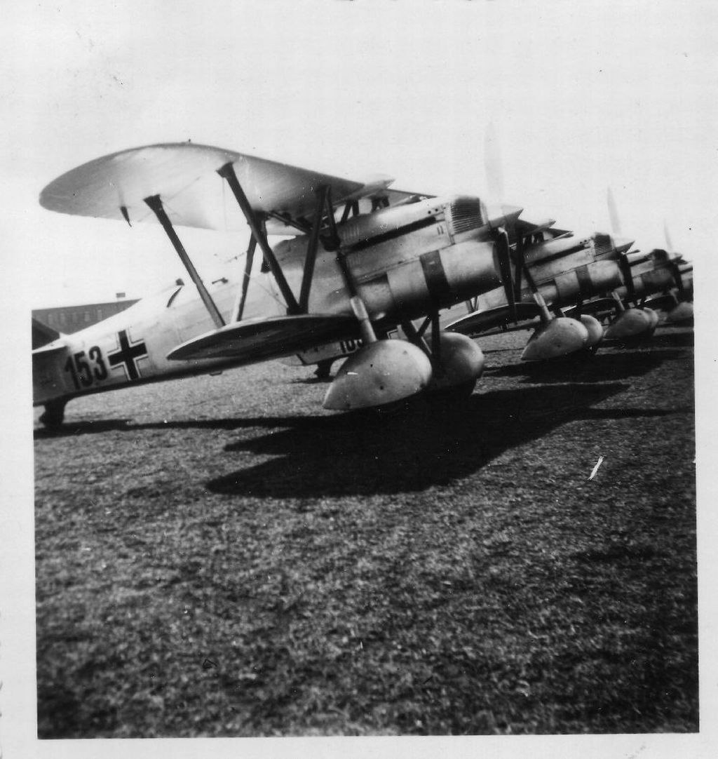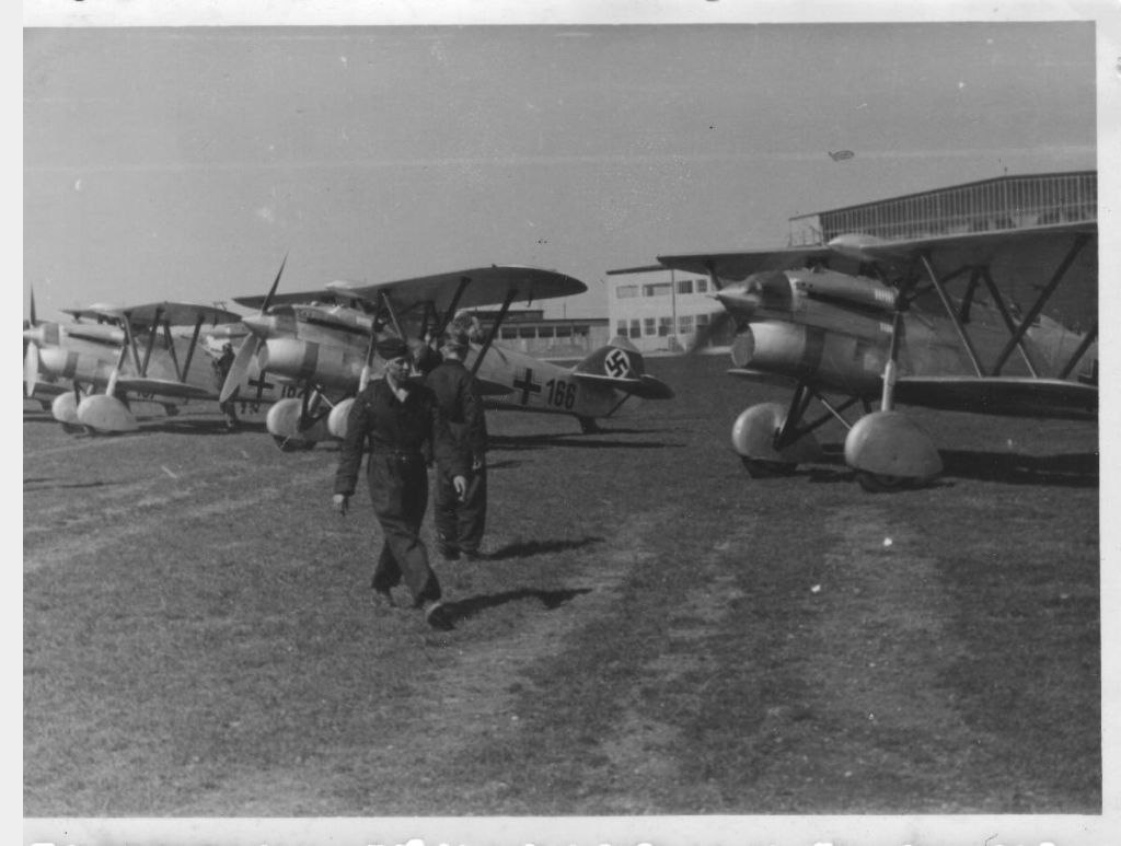 Nardi FN.305 прогревает двигатель. Аэродром в Северной Италии. Fiat G.50 используется в качестве учебного самолета в летной школе Castiglion del Lago, Центральная Италия, 1941. Белые полосы на крыльях обозначают учебный ЛА.