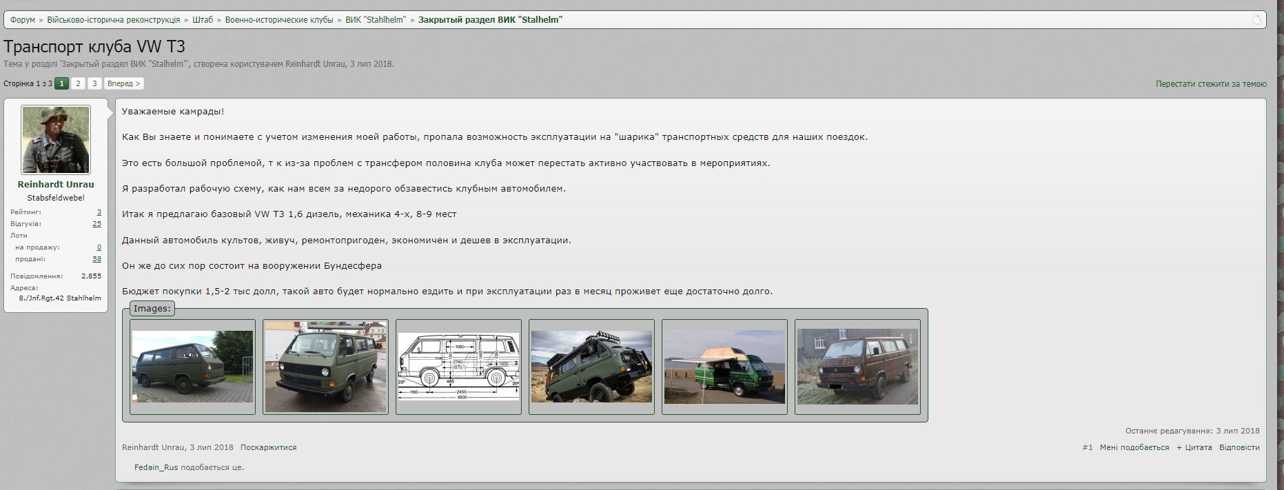 Гадаю що маю право викласти це в даній темі, гроші збирались на цьому форумі, модератори можуть ознайомитись с повною перепискою в Військово-історична реконструкція Штаб, Военно-исторические клубы, ВИК "Stahlhelm" , Закрытый раздел ВИК "Stalhelm", Tранспорт клуба VW T3