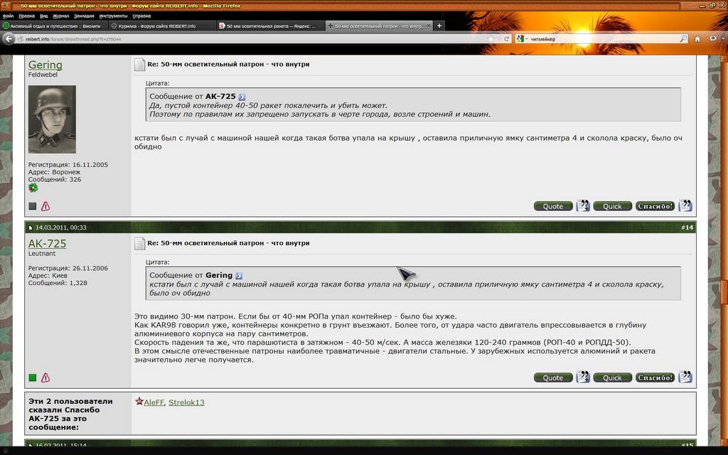Народ все это смешно наверное ..но не могу понять причем тут(LosLobos)это не значит что его были ракеты тем более у него таких давно не было..любого из вас могли так же показать..а насчет ракет и крыши внимательно посмотрите это видео снятое мною...что бы не было сомнений по поводу того что могут эти РОПДД-50 http://www.youtube.com/watch?v=3pqN-T8FV9c