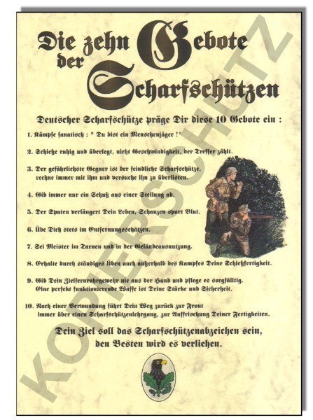 1 Бейся фанатично, ты охотник на людей. 2 Стреляй спокойно и обдуманно, не скорость влияет на счёт. 3 Самый опасный противник - это вражеский снайпер! Считайся всегда с ним и пытайся перехитрить его! 4 Делай только один выстрел из одного места/укрытия. 5 Лопата продлит твою жизнь, укрытие экономит кровь. 6 Тренируйся в определении растояний. 7 Будь мастером в маскировке и умело используй для этого местность. 8 Повышай мастерство постоянными тренировками в стрельбе. 9 Никогда не выпускай винтовку из рук, тщательно ухаживай за ней! Отлично работающее оружие - это твоя сила и надежность! 10 После ранения возвращаясь на фронт пройди курс снайпера для обновления твоих навыков.
