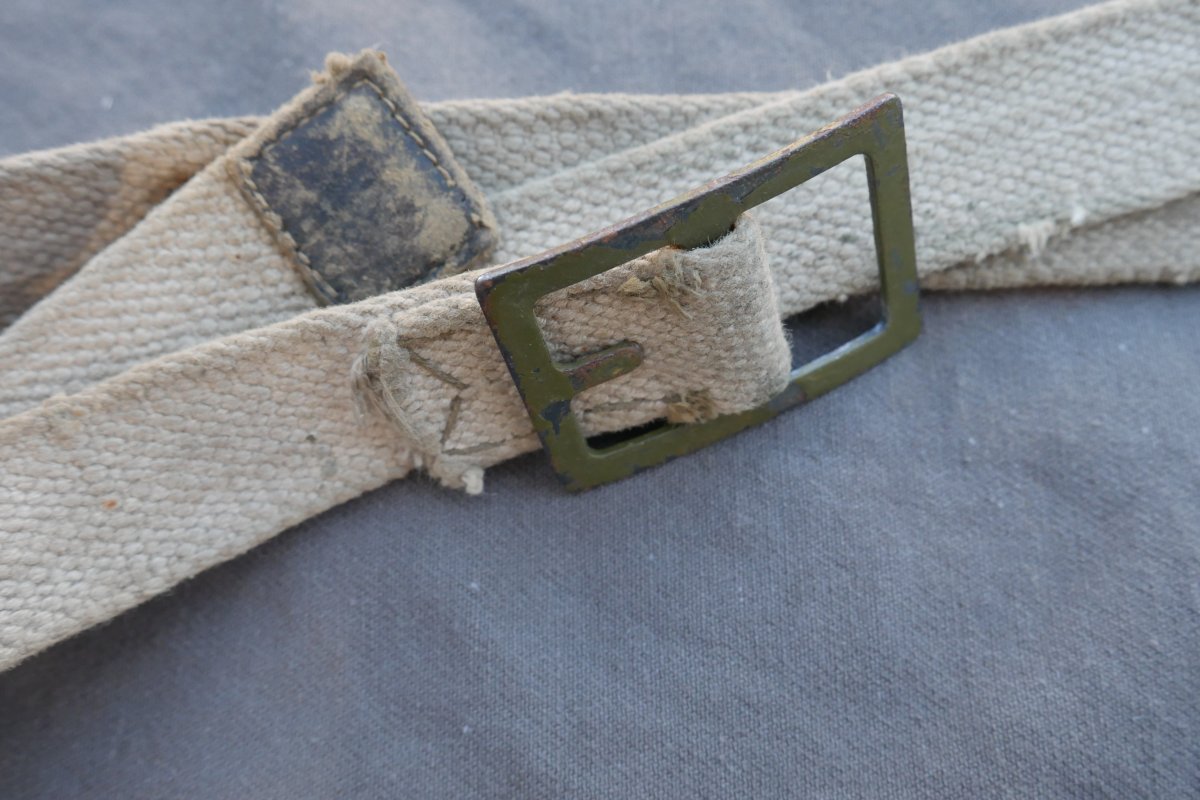 Судя по окончанию ремня и М-образная прошивка возле пряжки говорит советском происхождении. Неподвижный шпенек и значительное расстояние отверстий друг от друга наталкивают на мысль о допнике ,типа вьючного.