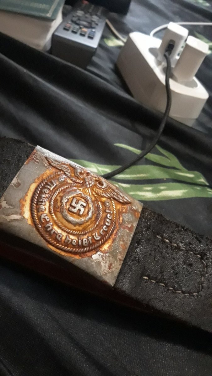 Добрый день форумчане. Нашел в продаже вот такой ремень. По заверениям продавца оригинал. Предоставлены фото, по ним видно что предмет скорее всего фуфло. А именно: тиснение на коже, состояние швов и самой кожи, отсутсвие клейм на пряге. Запросили жалкие 100 у.е. Тоже напрягает такая дешевизна. Как по мне 100%й фуфел. Ваши мнения камрады?
