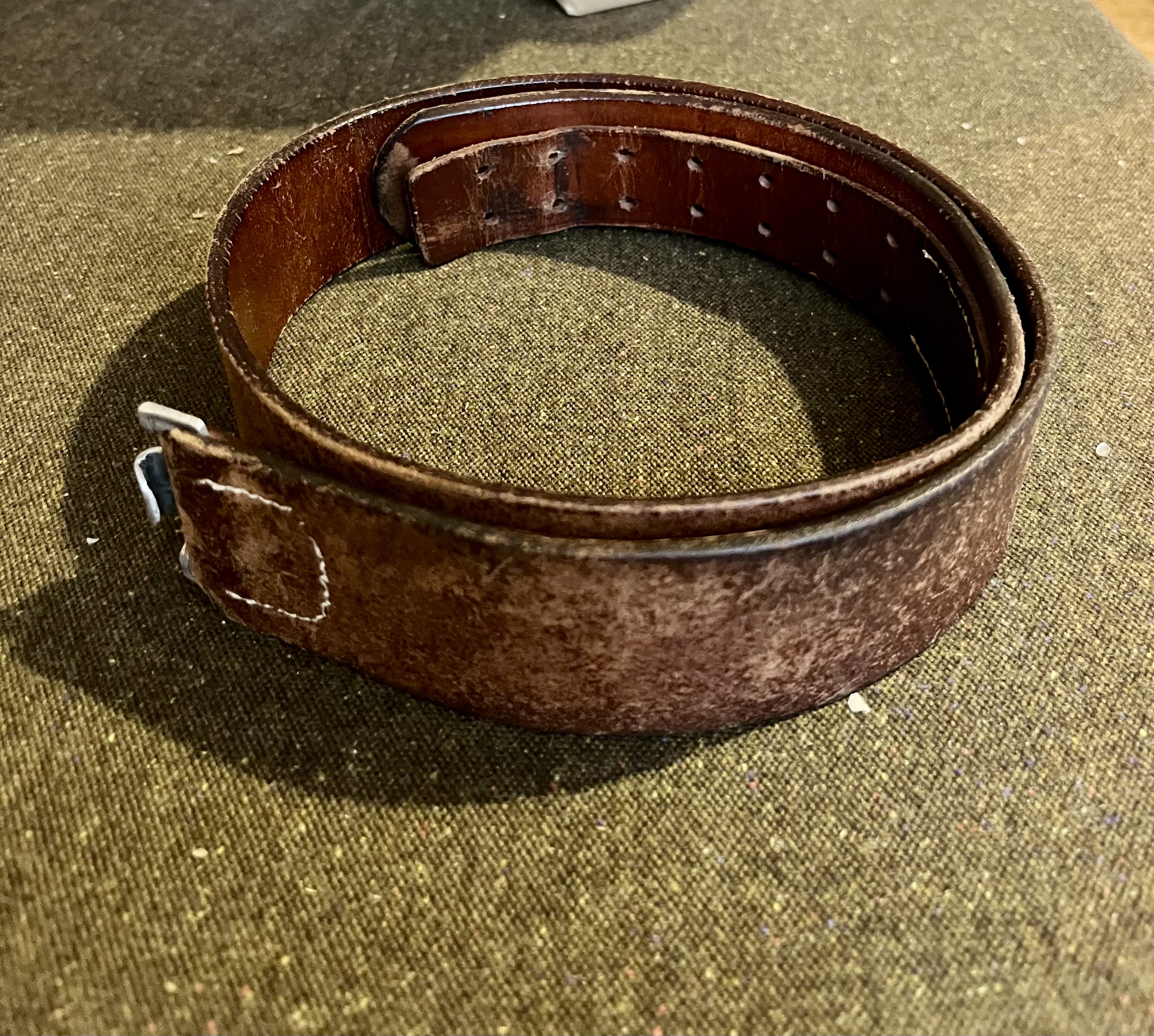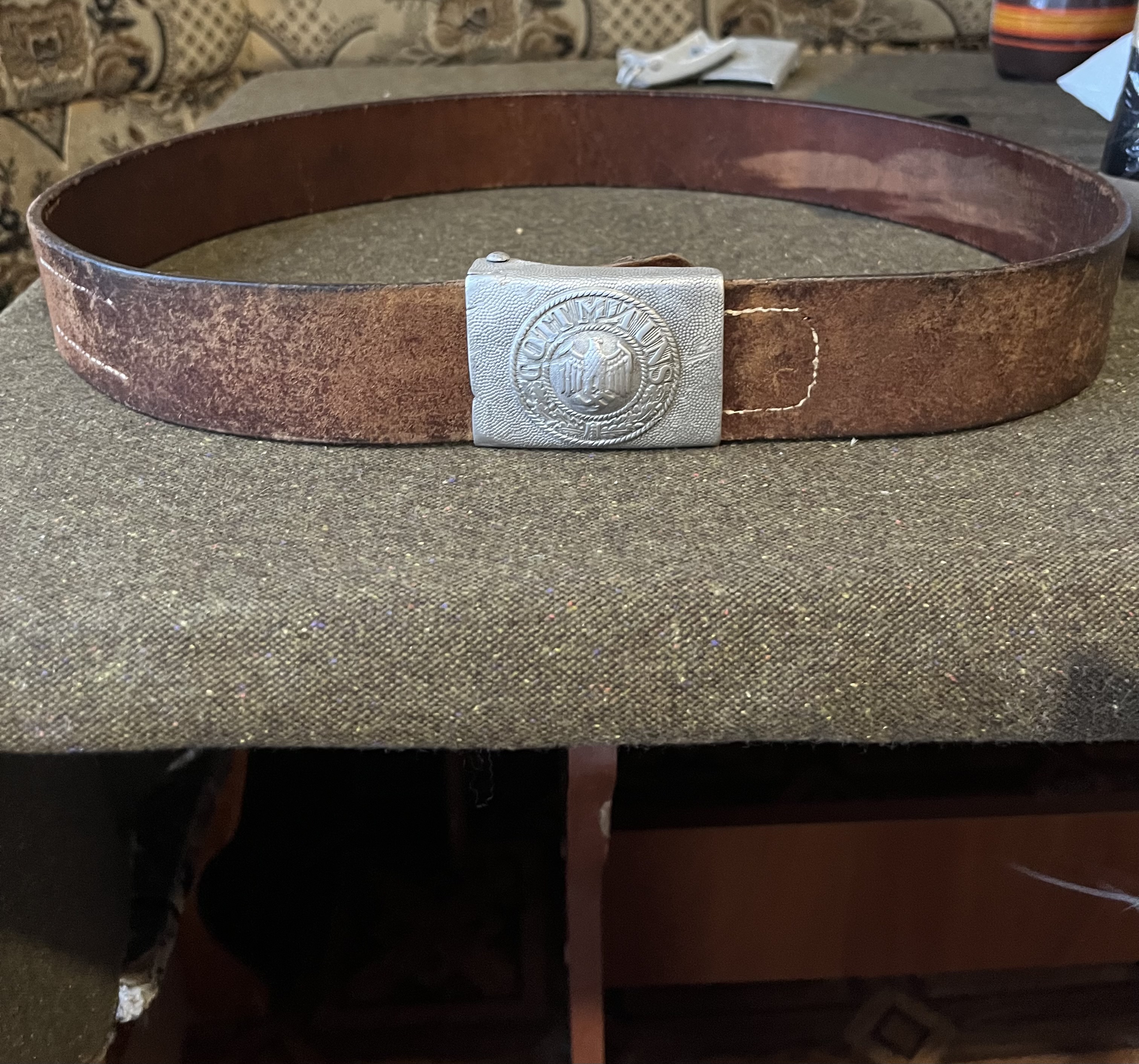 Ремень полная мурзилка. 1.Неизвестно оригинальная вермахтовая пряжка или фуфло. Нужно смотреть обратку. Состояние не очень. 2.Сам ремень(полотно) к вермахту никакого отношения не имеет. Клеймо стоит-Вещевое управление RAD (имперская трудовая служба рейха) - то есть стройбат. Изготовлено в Брауншвейге, 7 месяца 38 года. И клейма никакого отношения к батальону,роте и подразделению не имеет. Клеймо около крюка-это изготовитель(артель,фирма). Изначально этот ремень продавался таким: Spoiler: Фото Совпадение? Не думаю.. Цена, как некоторые "знатоки" высказались от 5000грн. - ооочень высокая. Если пряга оригинал-50-70у.е. Ремень(полотно)в таком состоянии 50-60у.е. RAD не очень пользуется спросом.