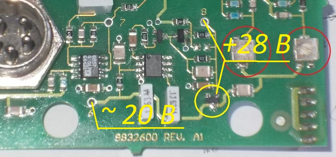 В точке 8 - постоянное напряжение, равное приблизительно +28 Вольт. Вместо диода там стоит транзистор (подключен как диод) - я его уже менял!!! А что насчёт второй платы? Может там глянуть?