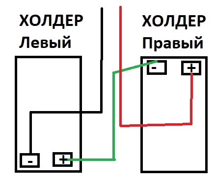 один холдер с тремя акб, красный и зеленый провода, а второй пустой с перемычкой. Перемычка должна быть направлена к плюсу с минусом?