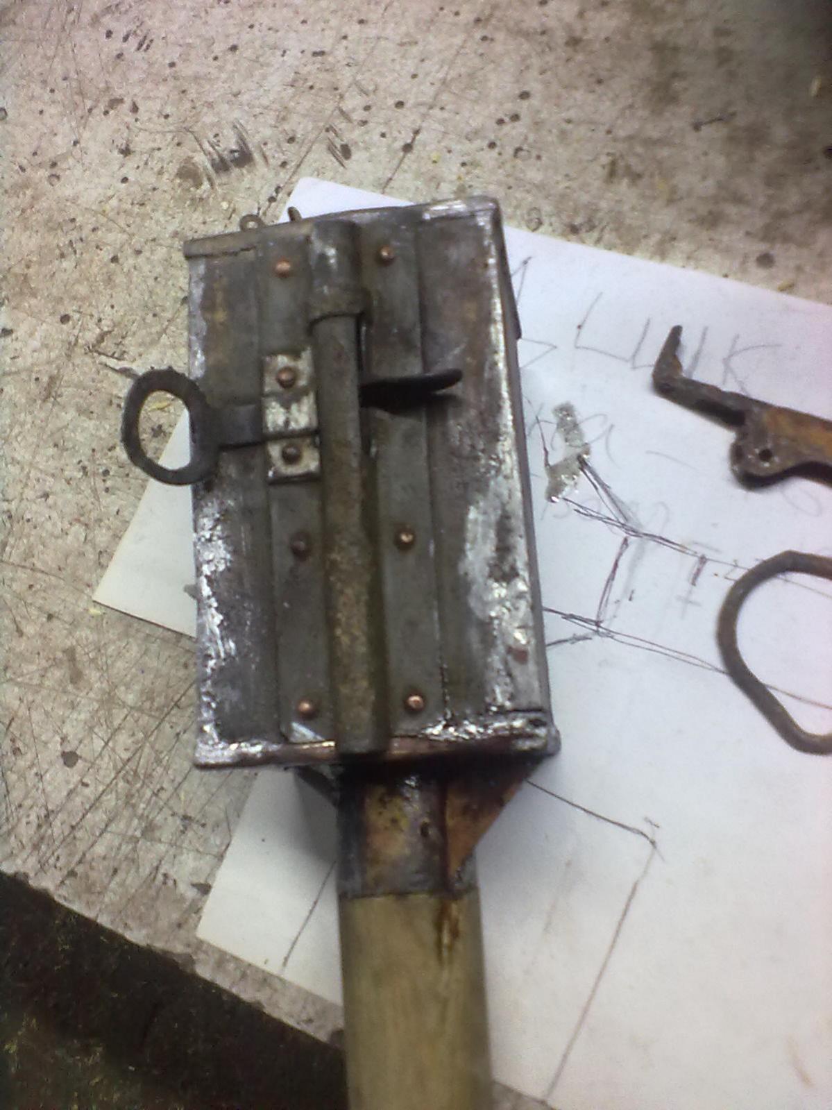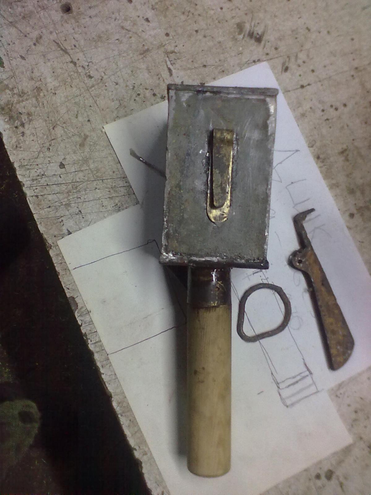 Осталось припаять еще 3 ребра жесткости и в ручке сделать углубление для рычага. Да немного наждаком пройтись по швам. Для изготовления 4й стенки использовал цинковый корпус инженерного заряда. Дно уже сделал из листа латуни. Зацеп тоже латуневый(легко паяется). И совет для тех кто будет паять цинк. Используйте мощный паяльник( больше 40ватт). Еще где то фото были процеса, если найду выложу.