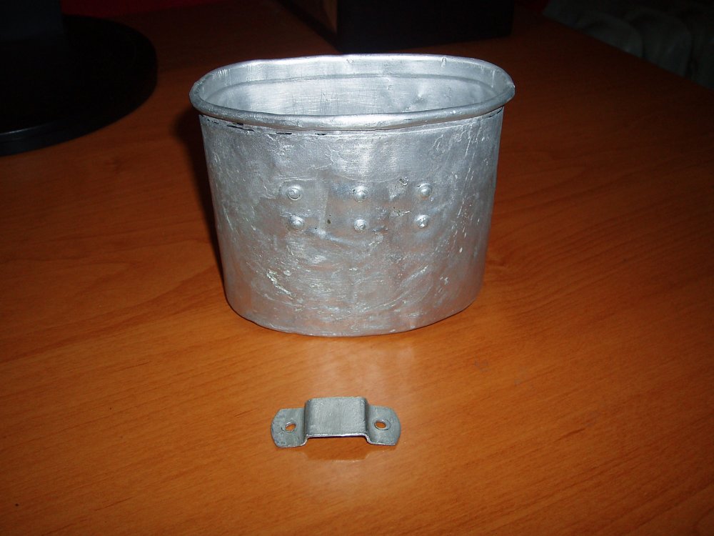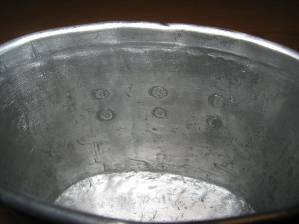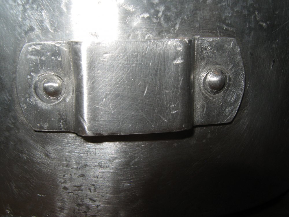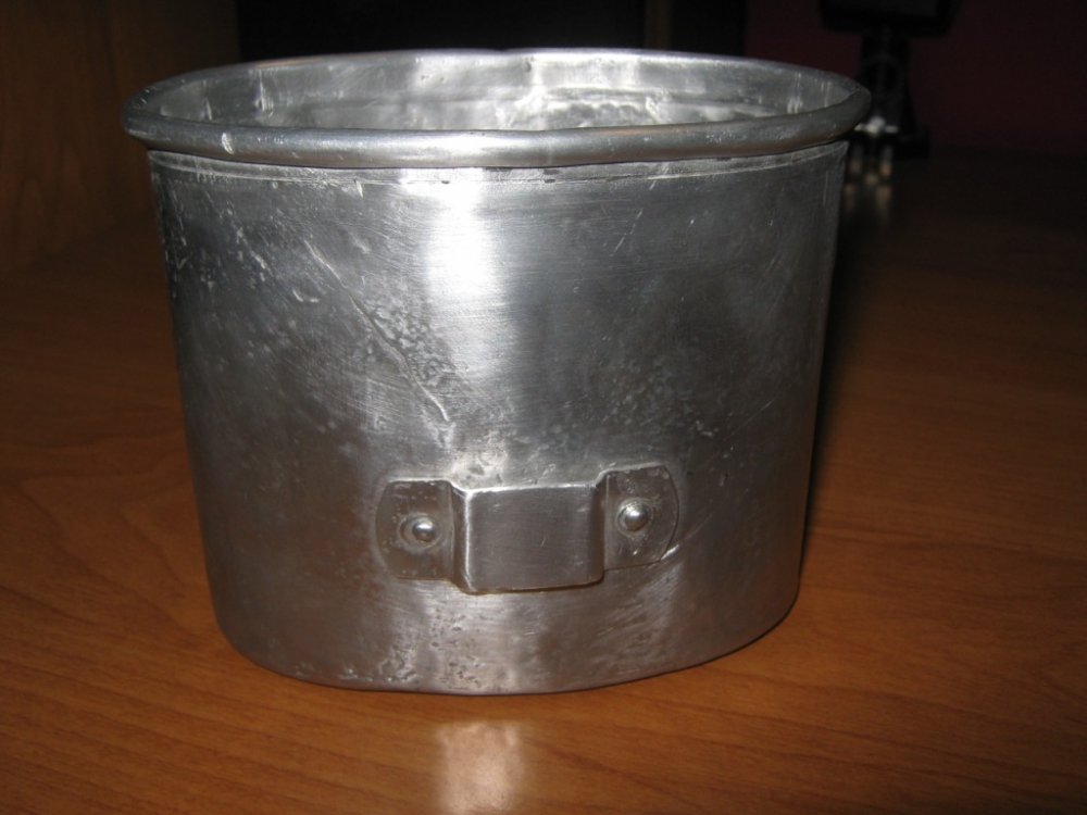 Вот мой. Делал с двух, на одном не было пластинки с клеймом которая держит ручки и был порез на стенке, снял ее с убитого стаканчика с кучей дыр и приклепал на рихтованный. На фото плохо видно, дно было сильно деформировано, сплюснуто, ну а так же бока были мяты. После рихтовки пореза практически не видно и держит воду, ручки сам делал по чертежам Юргена.