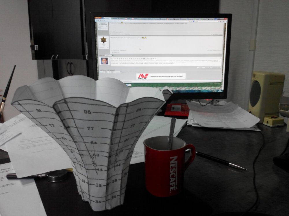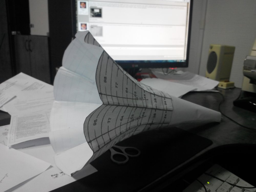 значит прдемет, внешне напоминающий по очертаниям изделие типо "торшер", изготовлено из обычной Хероксной бумаги, судя по форме "торшера" можно однозначно сказать что плотности сей бумаги явно не хватает, нужно как минимум ватман (следующий уровень джедайства). Кроме того, как по мне, лучше клеить резиновым клеем, потому как я клеил ПВА, он при высыхании дубеет и изменить форму практически не возможно. В целом, для себя решил что сложного мало, и при неоднократном повторении в результате имею возможность получить предмет похожий на раструб граммофона)
