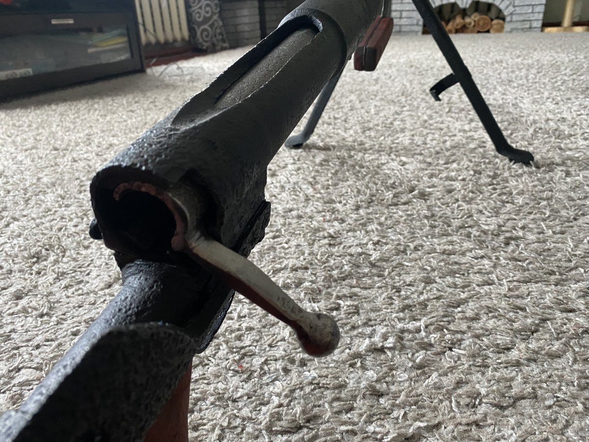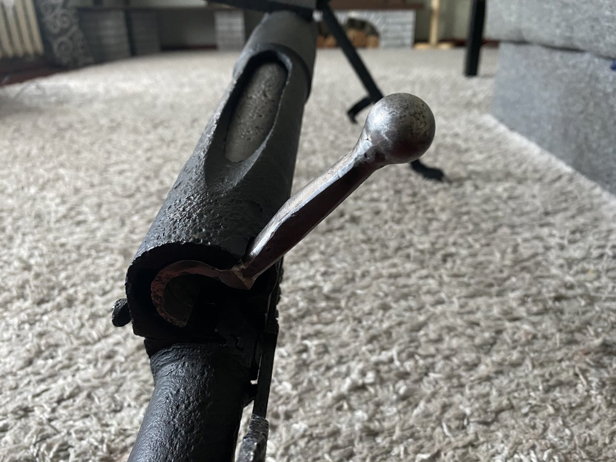 Немного продвинулся в восстановлении затвора. Благодарю камрада Бурчун, который поделился размерами нужных деталей. Пришлось немного провозится с напильником чтобы рукоять затвора не упиралась в раму. Теперь все отлично работает, досылается ММГ патрона и отлично выбрасывается. Теперь буду что-то думать с внутрянкой :confused: