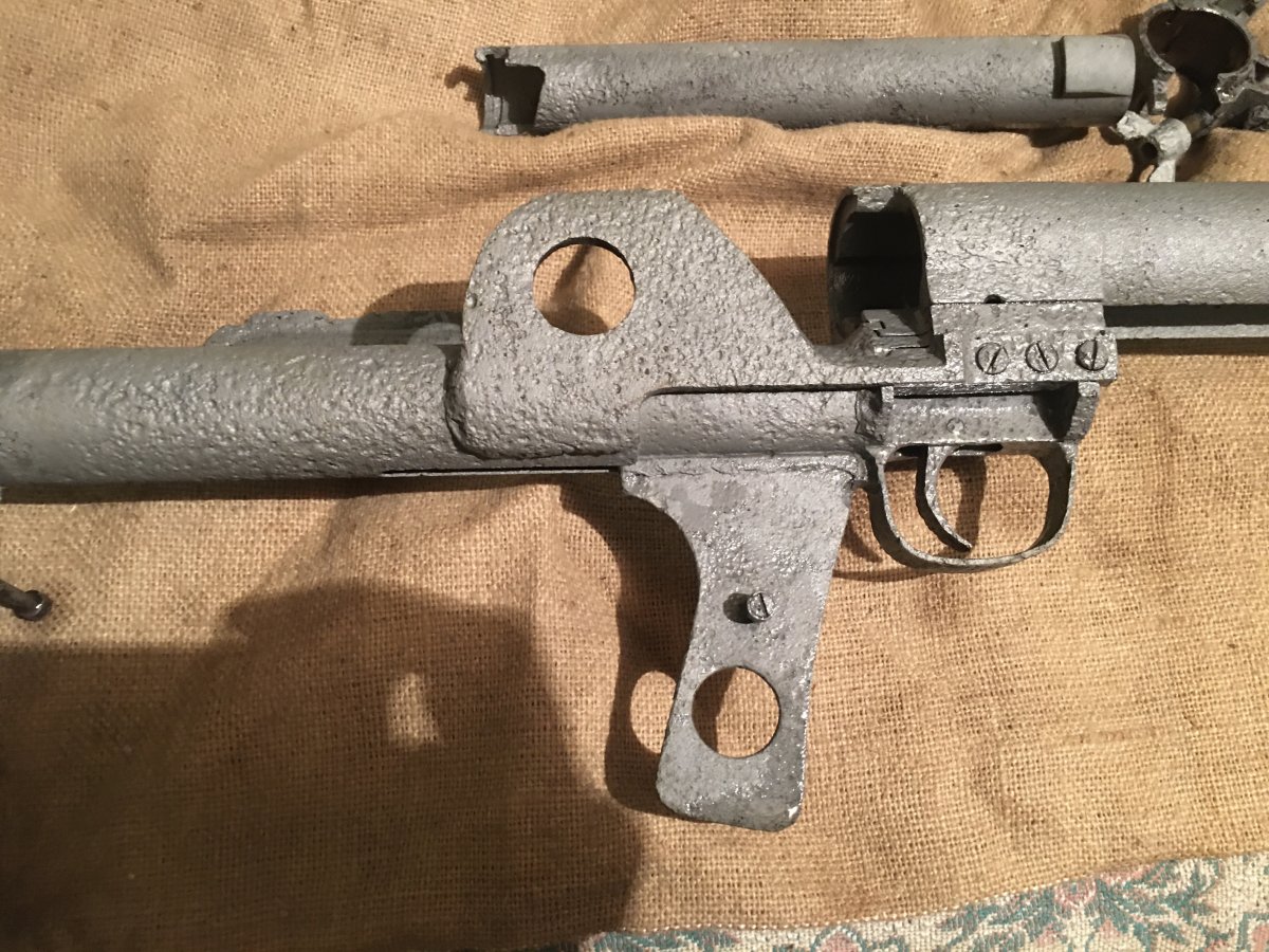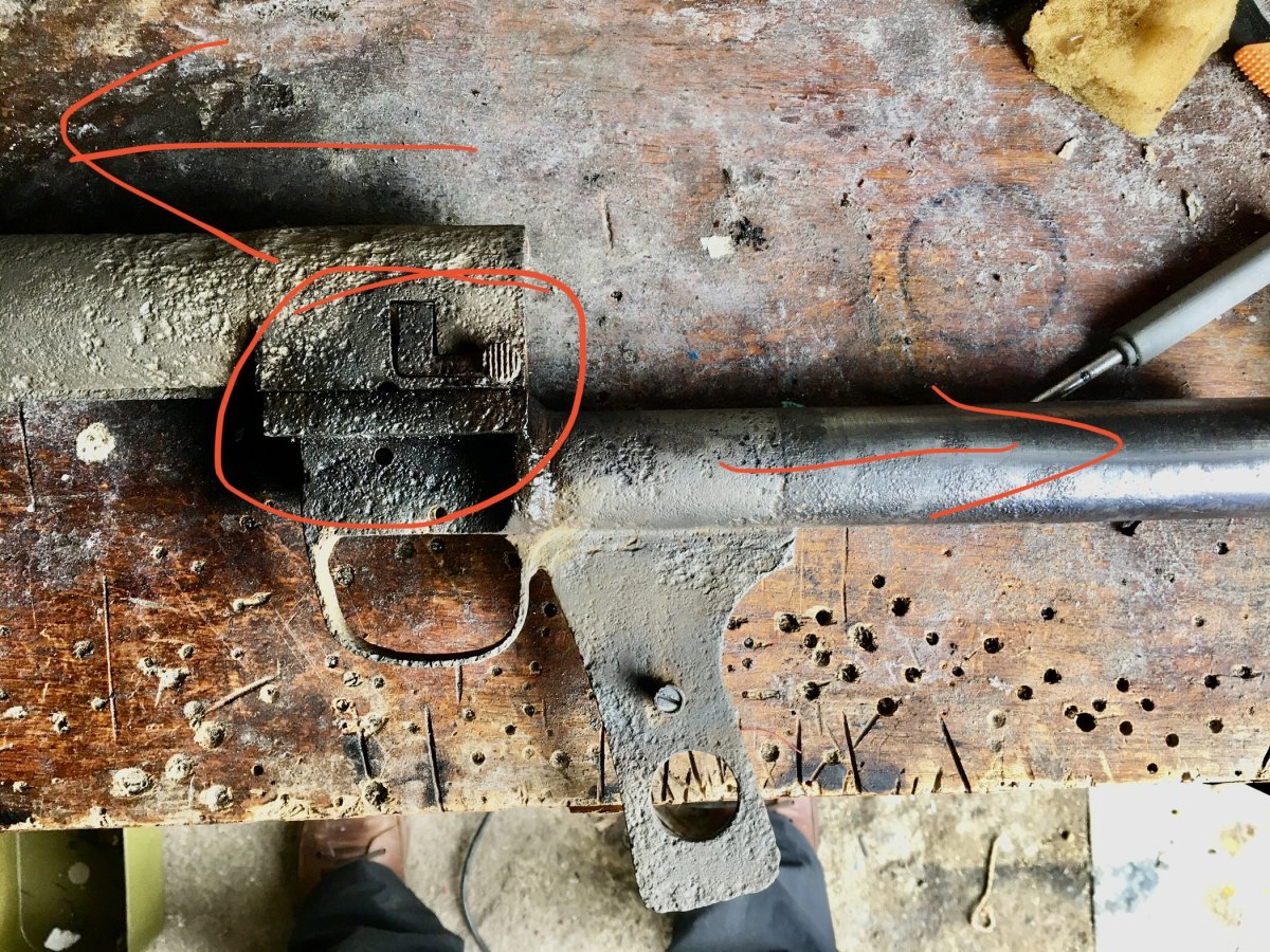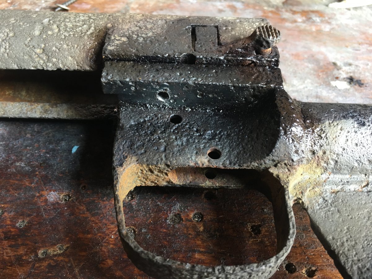 Здравия всем! Итак реставрация практически завершена. Было принято решение отказаться от шпаклевки и пока оставить в боевом виде (зашпаклевать всегда успею) так мне кажется выглядит атмосфернее! При попытке отсоединить ствольную коробку от рамы было установлено что существует как минимум 3 варианта расположения фиксирующего штифта. 1. Штифт стоит перед спусковой скобой, 2. Штифтов два и стоят они выше спусковой скобы на площадках с обеих сторон и 3. Как у меня штифт один и стоит на площадке с левой стороны по направлению ствола.