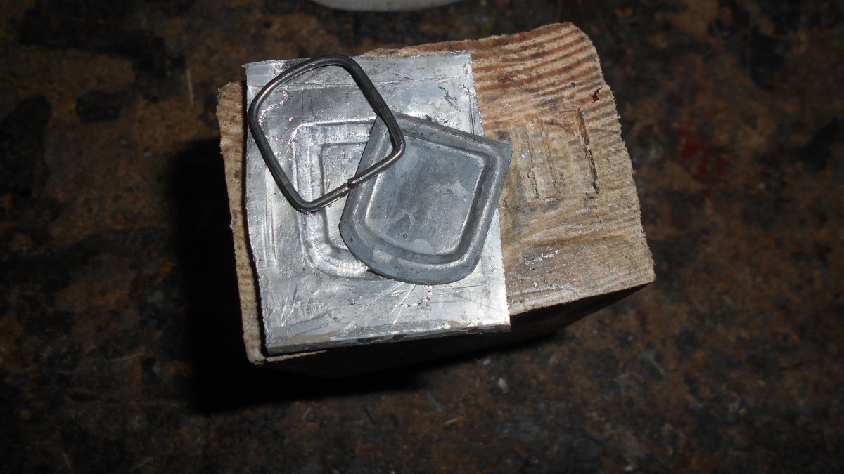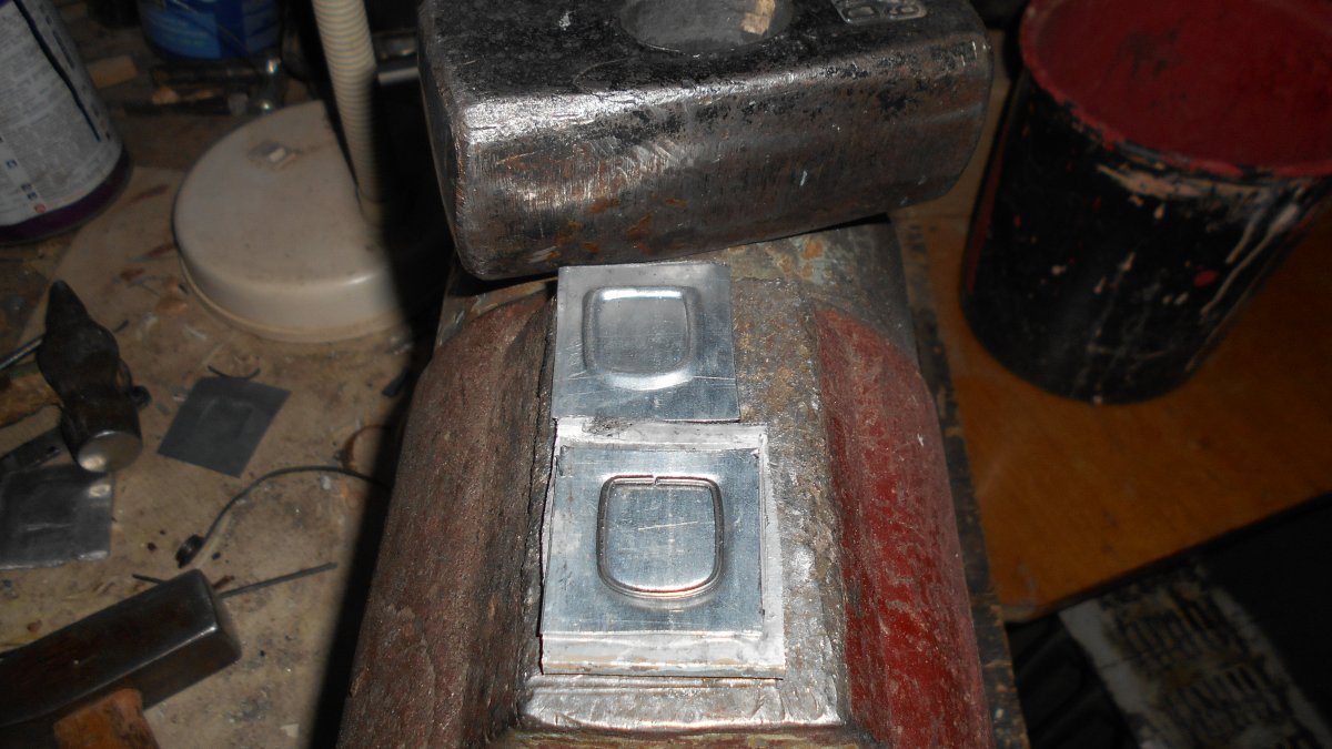 делал пуансон и матрицу из аллюмини DSCN2542.JPG я и стальной проволоки , потом ложил кусок жести и ударом небольшой кувалдочки без ручки все это дело штамповал ) самое сложное относительно попасть в размер поскольку проволока пружинит а аллюминиевая форма не долговечна но на десяток пряжек хватит .Потом все высверливал и надфилем поправлял .
