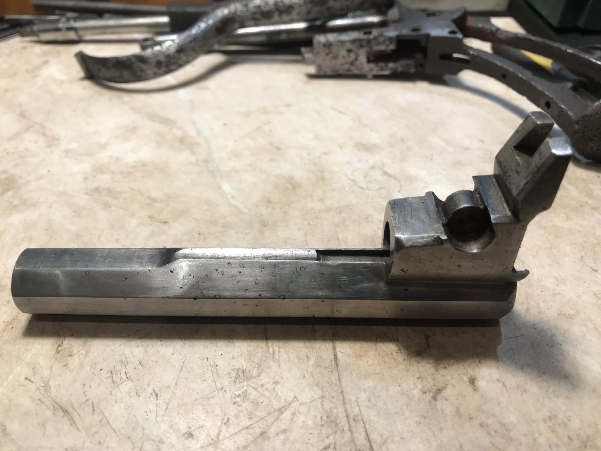 После промежуточной обработки. Следующий этап заварка мелких раковин на рычаге и придание ему окончательной формы, выведение граней. Также полностью убираются люфты в шарнирах. Что особо обидно сборочные клейма на спусковой скобе и шарнире стояли именно в местах наибольшей корозии. Их прейдется востонавливать по фото из интернета. Ударные клейма с нужной формой цыфр уже заказаны.
