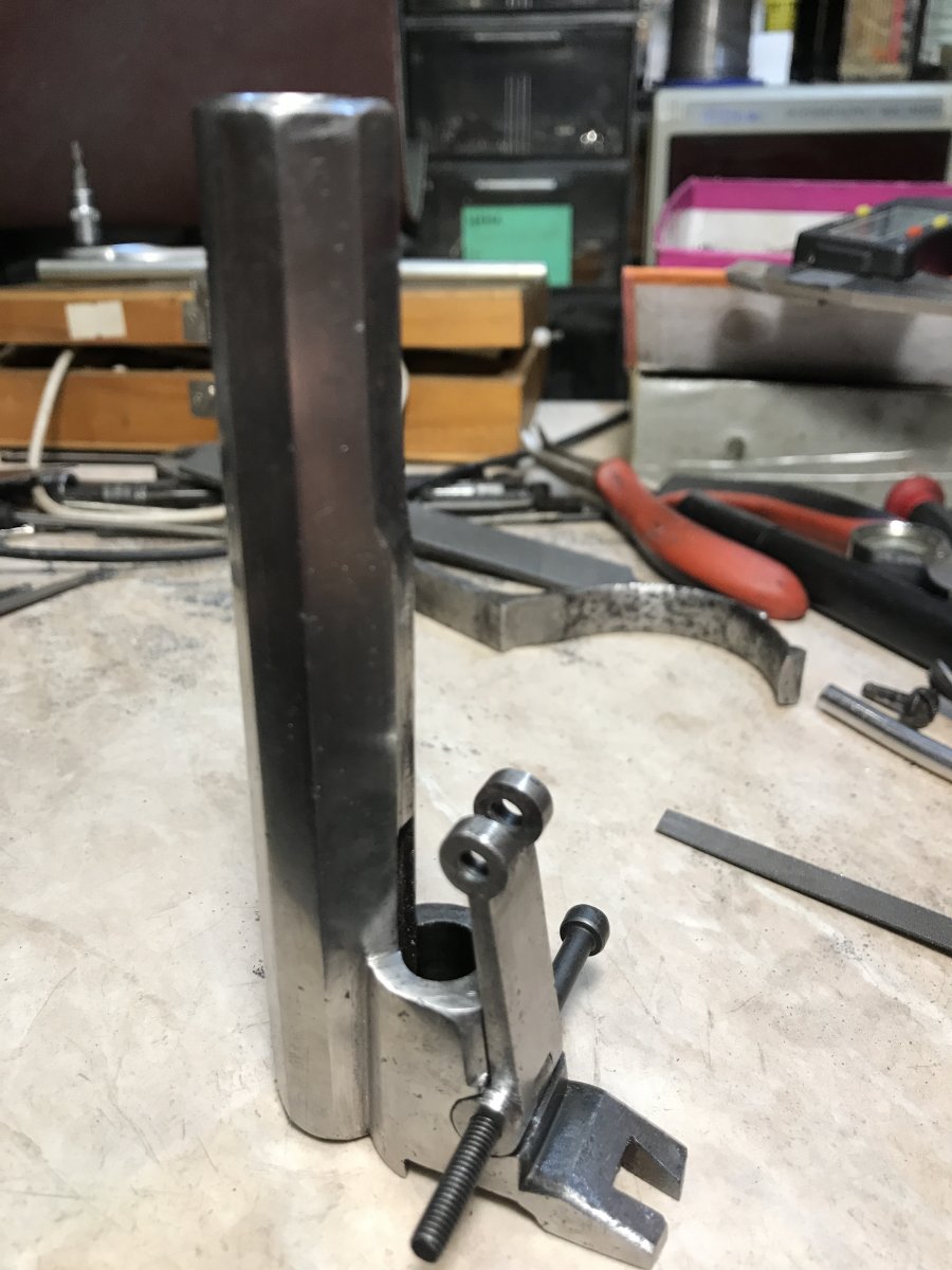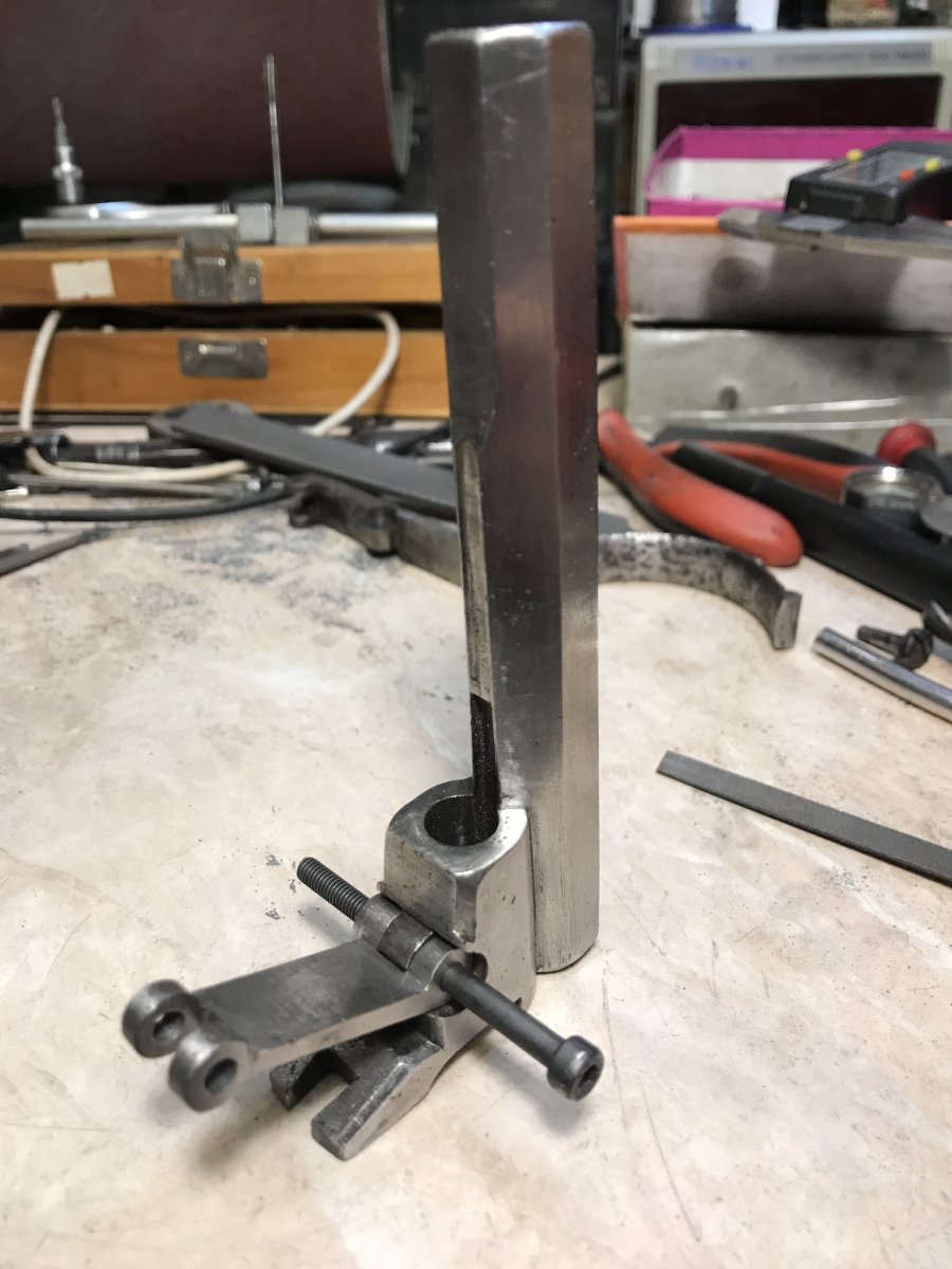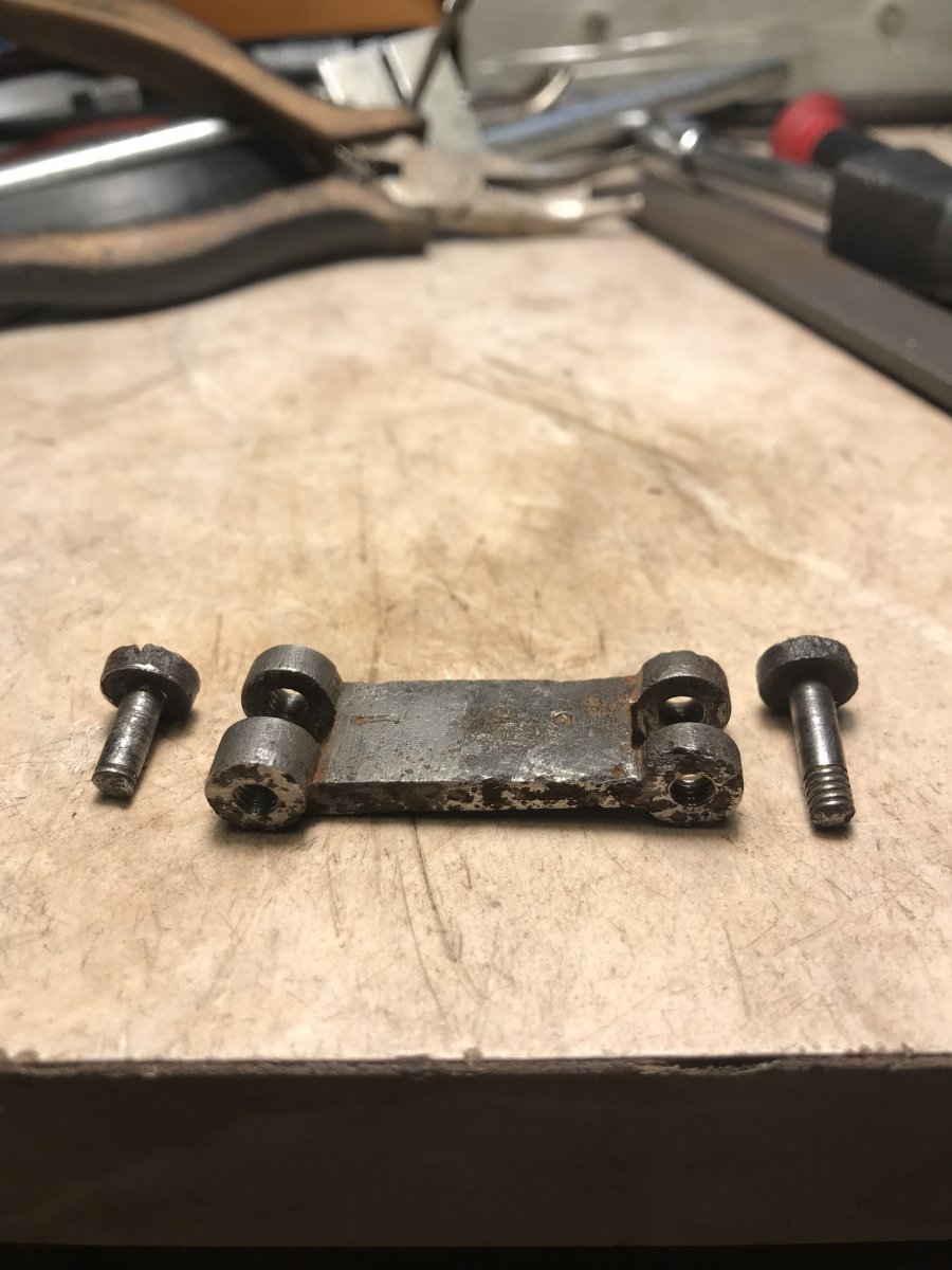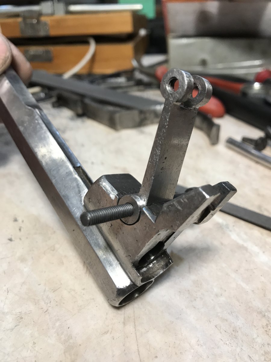 Приступил к восстановлению тяги ствола. Удалены сверлением остатки сломанного болта. Резьба близкая по шагу к нашей м4, разнится лиш толщина, у них где-то 3,55 мм. Резьбу удалось сохранить старую. На фото тяга перед подготовкой к сварке.