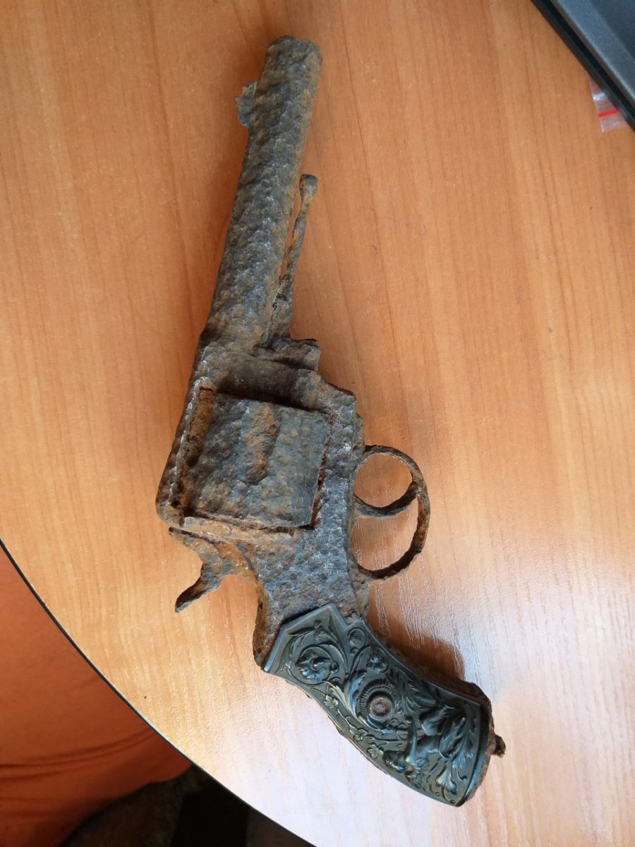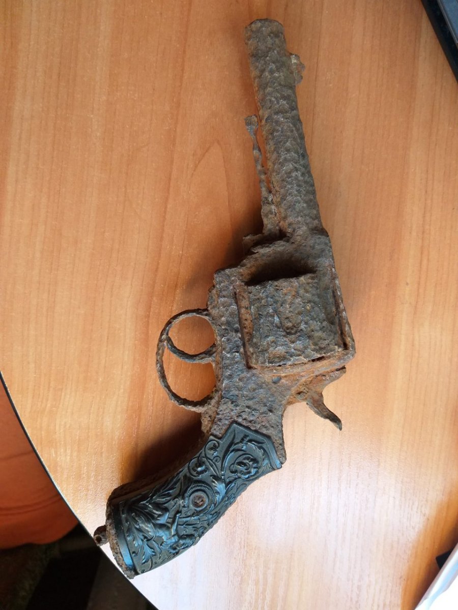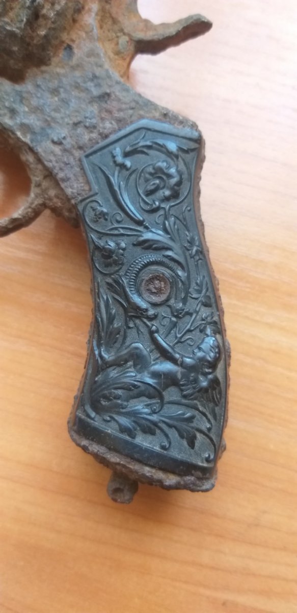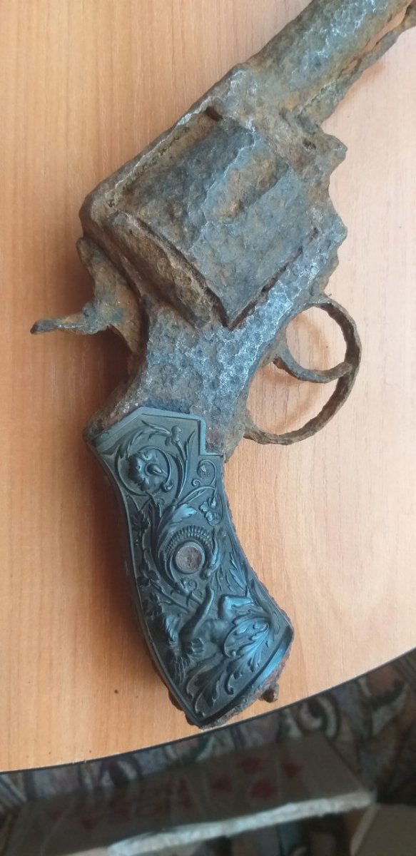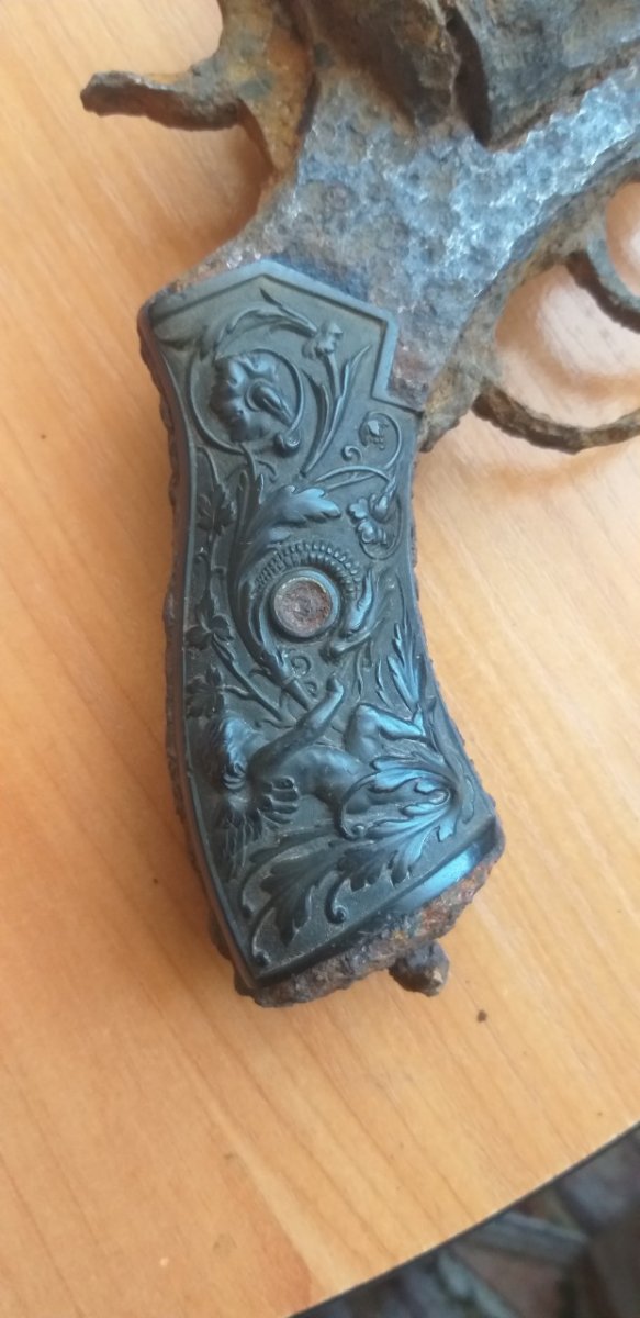 здравствуйте.уважаемые специалисты подскажите пж по данному предмету.знакомый нашел в огороде у родственников.особо не чистил.ствол заржавел насквозь.патронов в барабане не видно.возможно тоже полностью заржавели.интересует период предмета.производитель.правильное название и примерная стоимость для выставления на продажу на данном ресурсе.я так понимаю ценность представляют только накладки?это пластмасса или бакелит?сверлить ствол перед выставлением или делать подробные фото что он не сможет уже физически стрелять?если сверлить то где и сколько отверствий?и если выставлять на торги то в какой раздел и с какого старта.ему по месту предлагают 2000 гр.я сказал что продать всегда успеет и лучше выставить на обсуждение вдруг какой то раритет.заранее благодарю за любые ваши мнения и оценки.если нужны лучшие фото напишите в каких ракурсах и что фотографировать.с уважением