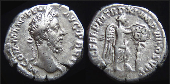 M COMM ANT P FEL AVG BRIT, laureate head right / SAEC FEL P M TR P XI IMP VII COS V P P, Victory standing right on helmet, holding shield on palm and inscribing it with VO/ DE. RSC 664.