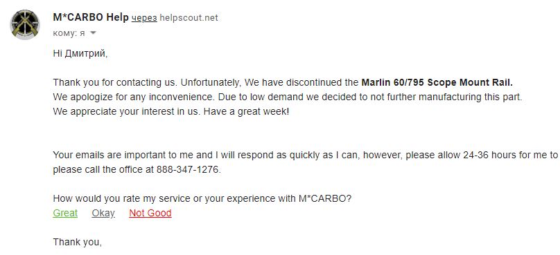 Ris планка на Marlin 795/Marlin 60 от MCARBO. Оригинал, произведена и куплена в США, сделана специально под Marlin 795/Marlin 60, у которых слегка специфичный угол ластохвоста, из-за чего стандартные планки могут смещаться во время эксплуатации. Так же еще одним преймуществом данной планки является максимально низкий профиль. Абсолютно новая, запакованная. Ну и да, MCARBO их больше не выпускает, да. Цена- 30$ Наложенный, предоплата. Отправка новой почтой.