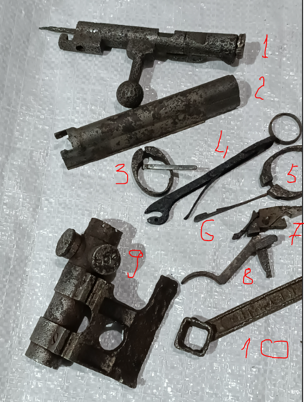 Приветствую. На будущее, когда выставляете на определение набор предметов - выполните схему с нумерацией каждой детали. Этим Вы упростите себе и тем, к кому Вы обращаетесь задачу - ибо на форуме спрашивающему никто ничего не должен. Как задаете вопрос - так получаете ответ. 1 - остатки затвора винтовки системы Бертье - для нормальной оценки сделайте проекционные фото - видится деформация ударника с курком, а это важно. Также опишите функциональнеость затвора - разработан или нет. 2 - крышка затворной коробки СВТ-40 - как показывает практика 200 грн еще нужно сильно постараться, чтобы дали. стартовая 100 грн. а то и 80 грн. 3- малое разрезное кольцо второго типа на М91 - нужнф нормальные фото с боков и с обеих сторон, наличие клейм - это важно и влияет на цену. Пока от 80-100 грн. 4 - крышка подавателя магазинной коробки винтовки М91 - бонус к чему-то 5 - большое разрезное кольцо второго типа на М91 - читаем пункт 4. по такому состоянию пока от 50-60 грн. 6 - ранняя ("кованная") большая ложевая пружина на М91, судя по клейму Ижевск после 1928 года, с обломанным усиком - бонусом к кольцам. 7, 8 - набор деталей УСМ Маннлихер М1895 - вместе порядка 100-120 грн. для старта. Ажиотажа не будет. 9 - 1500 грн - маловероятно. стартовая для набора 800 грн. и далее как пойдет. 10 - на любителей ключей - в таком состоянии от 30-40 грн.