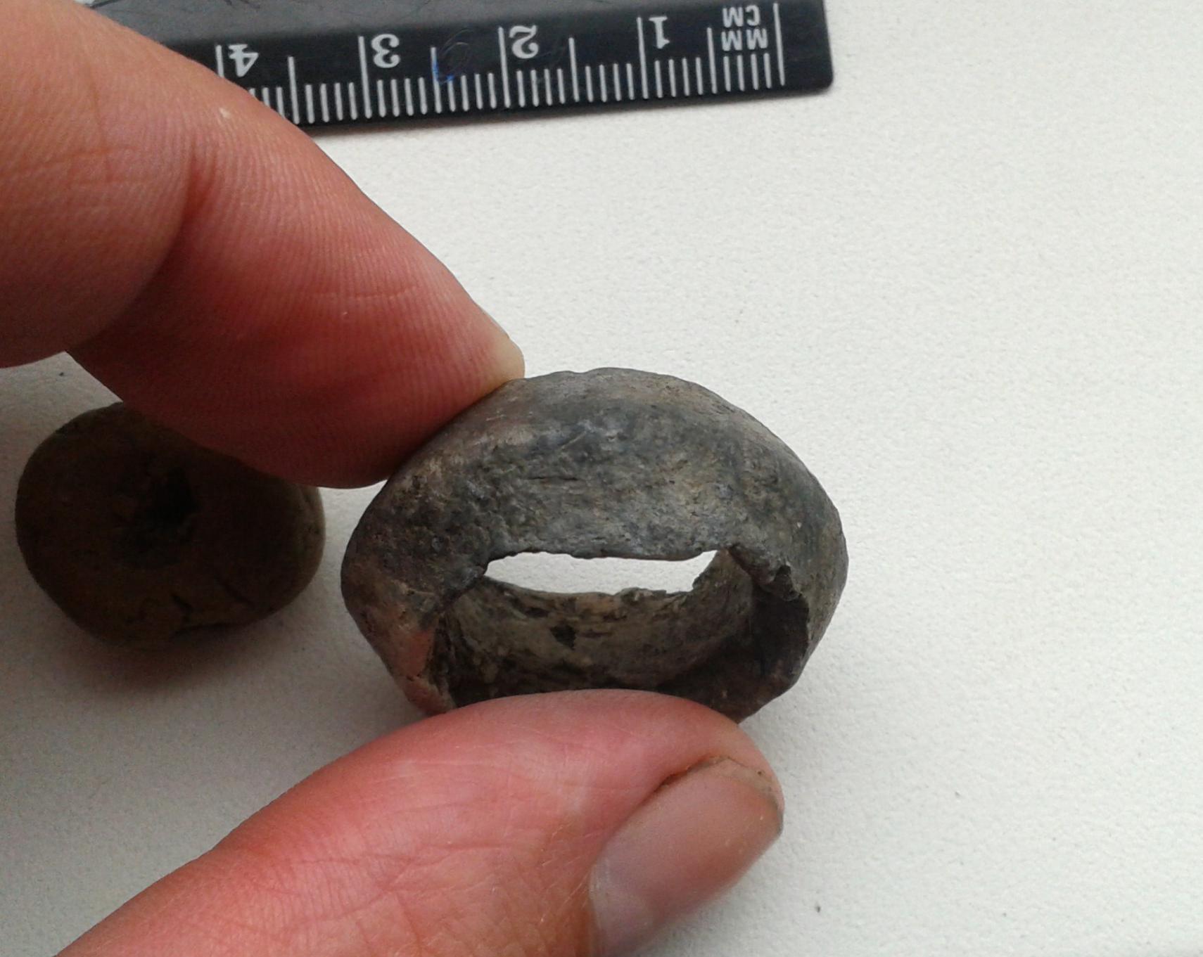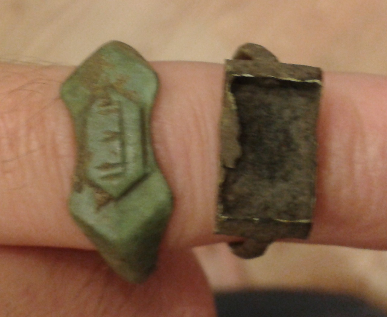Керамика неопознанная и всякие пронизки-накосники и кусочек кольчуги. Сначала думал, на перстне надпись на куфи.