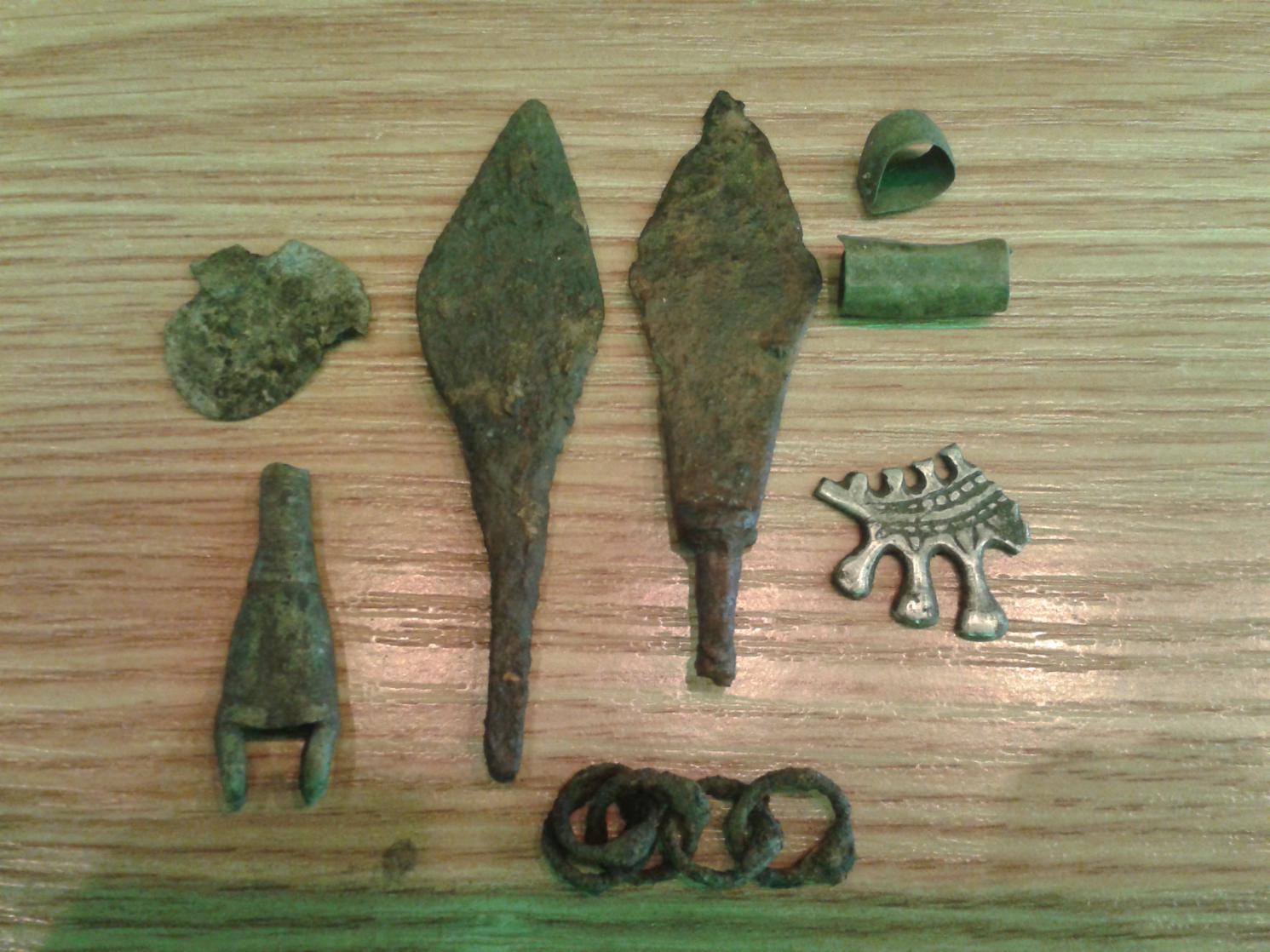 Было немного находок. Ко мне приезжал знакомый и сагитировал в поездку. Как новичку, ему повезло найти замечательное биконическое пряслице. Его на фотографиях нет, ну и я наковырял маленько. Стрелки трехлопастная, трехгранная, листовидная без упора, срезень, браслет и целая лунница. Лунница откисает, что из нее получится пока непонятно. У срезня черешок загнут под прямым углом, получится исправить или нет тоже вопрос. Есть трещина. Думаю погреть газом, если Бог на нашей стороне, то черешок не отвалится. Хотел сфотграфироваться на стене для масштаба, но я в камуфляже и меня почти не видно .