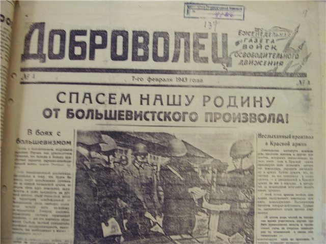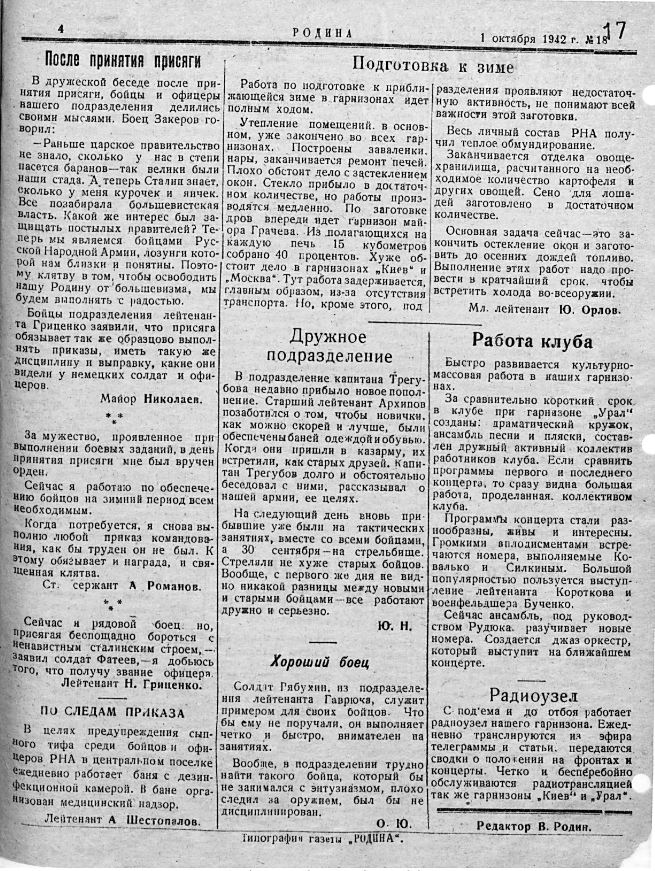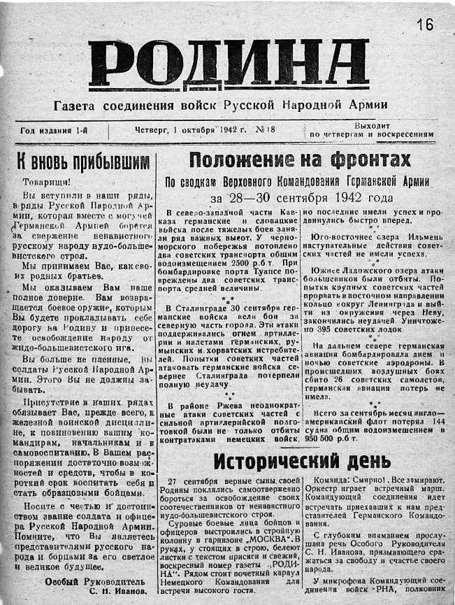 Газета соединения войск Русской Национальной Народной Армии (РННА) «Родина». Пос. Осинторф, №18 от 1 октября 1942 года. Ред. капитан Родин. Первые номера газеты выходили в виде стенгазеты, затем выпускалась типографским способом. Источник.