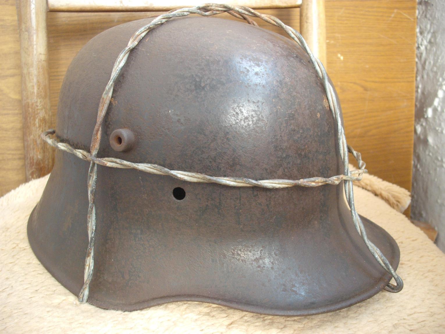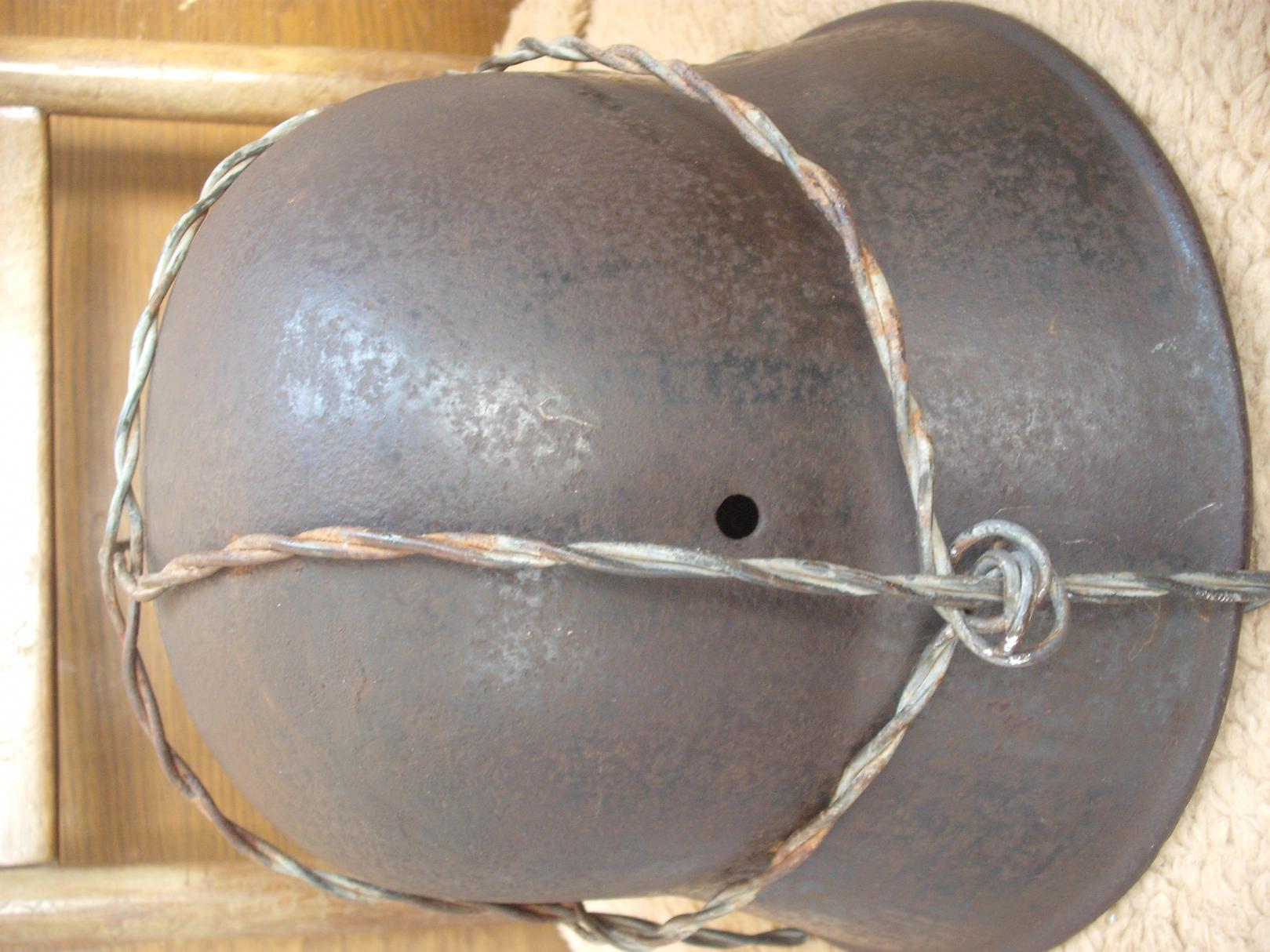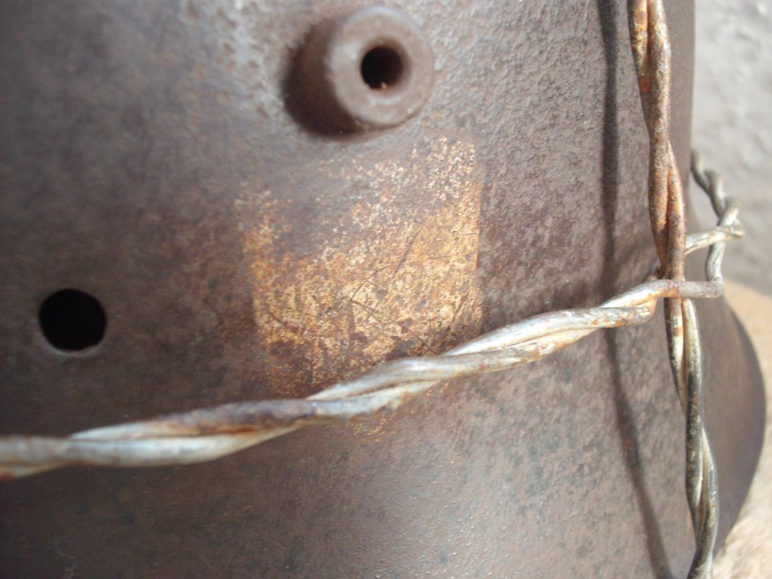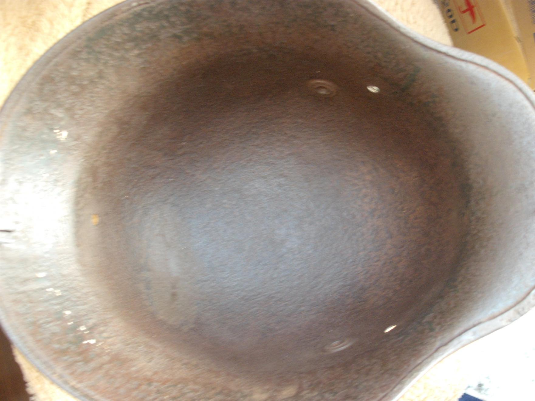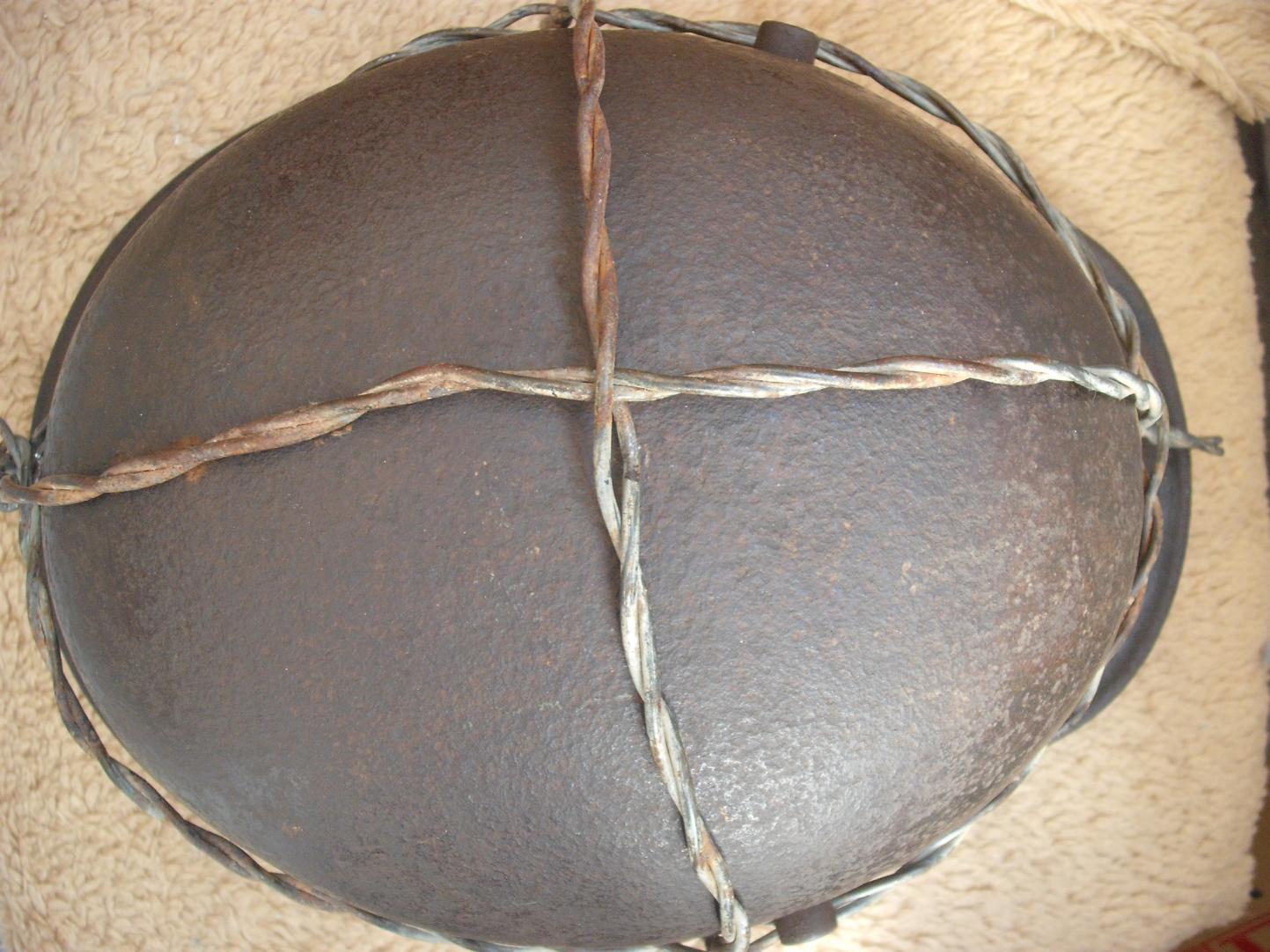 Оцените пожалуйста каску - рогач М18 большого размера (по наружным кламмерам 69 см.), с остатками декали. Оригинальный окрас около 85%. Обрамлена в проволоку подкрепления камуфляжа. Имеется клеймо "ET68".