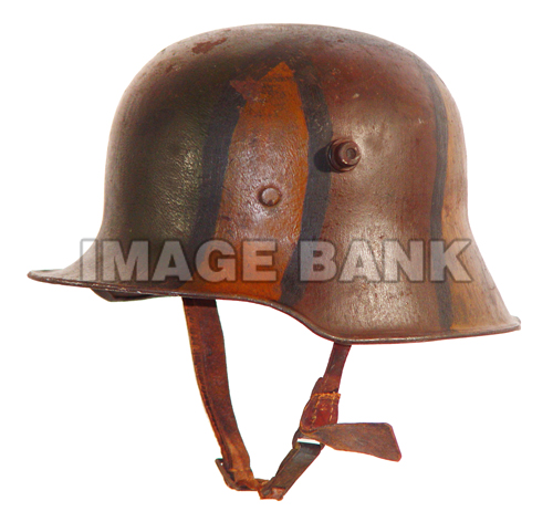 Немецкая каска М16 (Stahlhelm), прозванная англичанами "ведерком для угля", делалась из стали с хромо-никелевым покрытием, по бокам имелось по одному вентиляционному отверстию в виде трубочек. Благодаря заушнам и назатыльнику она гораздо лучше защищала голову солдата, чем французская каска системы Адриана или английская, напоминающая о временах средневековья. Внутри каски располагался амортизатор на кожаном обруче, а подбородочный ремень можно было регулировать по длине.