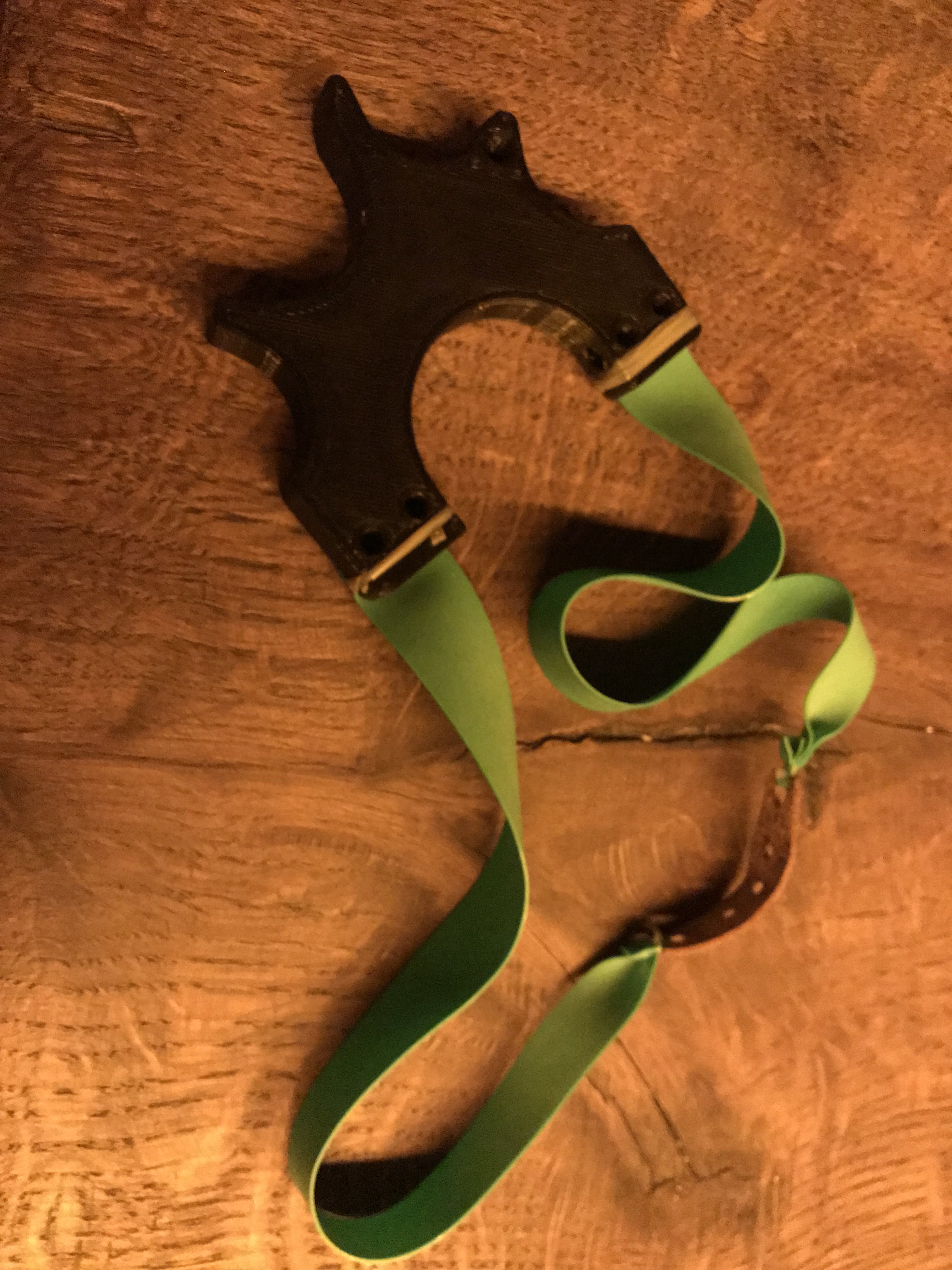 Працює досить офігєнно. На буржуйських форумах з ними навіть полюють і викладають відоси. Є варіант з монотягою, це класичне виконання: щодо принципу, гадаю ліпше раз показати ніж сотню разів описувати. За запитом frameless slingshot, впевнений, знайдете більш детально відео в мережі. Від себе можу додати два популярні варіанти хвату. Для обох початкова позиція така: Перший називаю прямим. Тобто тяга просто безпосередньо перегинається через фалангу вказівного пальця. При такому хваті без через брак досвіду пристрій може вилетіти з руки після пострілу. Другий - називаю парадиним: середній і безіменний пальці перехоплюють тягу і проводять через фалангу все тогож вказівного: В результаті маємо щось таке: Плече прикладання сил маленьке, тому супротиву гуми майже не відчувається. Із мінусів - при тривалій стрільбі може виникнути тонельний синдром у лівому предпліччі - це не айс. А так дуже бюджетний і веселий спосіб пуляти. Петля на паракорді знизу слугує для налаштування довжини тяг. Вони не симетричні через анатомію руки. Під великий палець завжди роблю коротшу. Ну і ще є нюанси, чому так роблю, але про те потім може повідаю. Найпопулярніше питання: "а не шкода пальці?". Відповідь - тренуватись треба на послаблених тягах щоб подолати психологічний бар'єр. Навіть на них можна добряче отримати лящів через недбалість хвату правої руки, тому після такого ваші дерев'яні рогачики у безпеці і попадяння по них мінімізоване. З досвідом можна пробувати заряджати і підножні снаряди: каміння, окатиші, гайки якщо є підходяща кожетка. Відсотків на 99 це безпечно. Випадкові попадання на зриві навіть якщо і відбуваються, то по дотичній під гостим кутом, шкіра лишається неушкоджена. Із плюсів: це до біса компактна штука. Її можна замотати у хустку і носити на руці як браслет (замотують щоб мінімізувати вплив ультрафіолету від сонця). Виготовляється максимально швидко. З каучукових канцелярських гумок можна виготовити таку, що досить міцно зможе вломити. Ну і люди часто дивуються, коли таке бачать. Дійсно екзотичний спосіб метання снарядів. Горизонталь тримає досить впевнено. (металева труба Ø40mm на дистанції 50 метрів уражається в більшості випадків). Є ще варіанти з плоскими тягами, але я не заморочувався. Гума для того є. чекає свого часу.