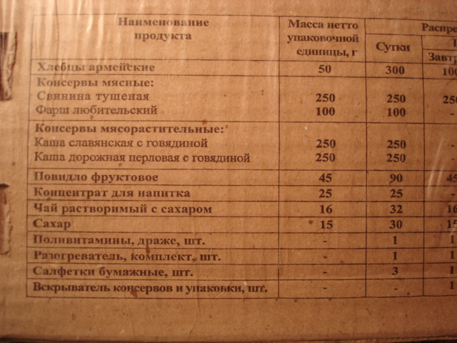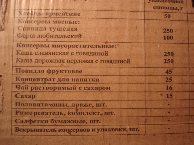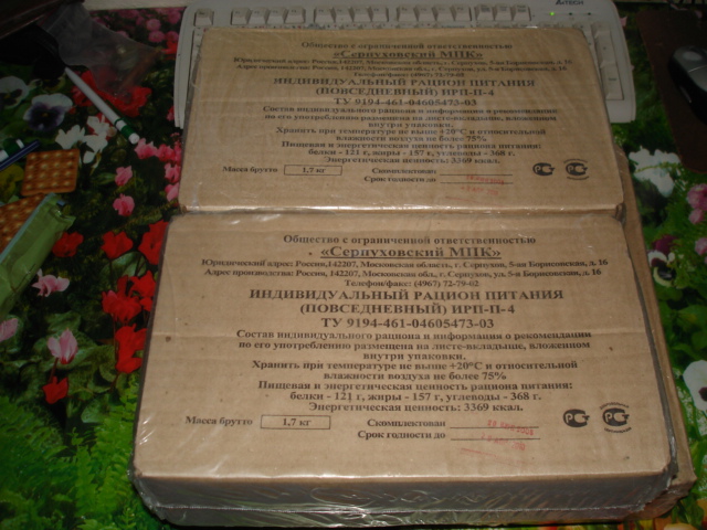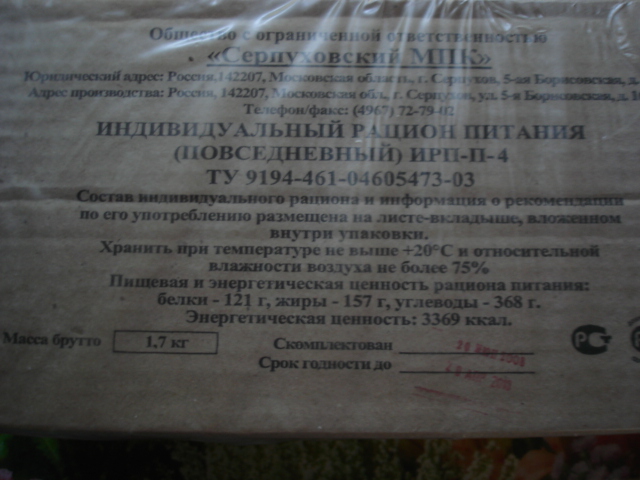 ещё есть ИРП-П-1. Срок годности части вложеных продуктов истекает в июле( всё кроме консервов мясных и мясорастительных- у них срок годности ещё более года) . Лично за вчера и сегодня съел два сухпая, всё в норме и продолжаю употреблять. цена 40грн за шт + пересыл P.S. дата указанная на упаковке "годен до" означает конечный срок выдачи со склада в текущее довольствие.