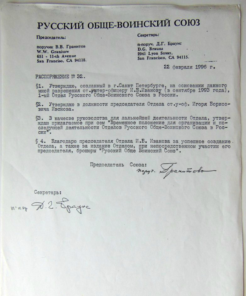 Во время Съезда 1991 года Союза Чинов Русского Корпуса (и РОА) было издано «Обращение к бывшим офицерам Советской армии…» с целью присоединения к зарубежному Белому воинству. Выполняя решения Съезда в составе прибывающих в Россию делегаций Русского зарубежья, прежде всего обще-кадетского объединения, Председатель РОВС поручик Гранитов В.В. стал проводить встречи для поиска офицеров и генералов бывшей Советской армии и переносу работы РОВС в Россию. С этой целью Председатель РОВС пор. Гранитов В.В. во время поездок в Россию стал встречаться с различными воинскими и общественными организациями с целью разобраться лично в ситуации и для оказания денежной помощи (500$) патриотическим антикоммунистическим организациям на Белое движение. По настоятельной просьбе школьного учителя сержанта Иванова (Лискина)И.Б. было получено в сентябре 1993 года разрешение на открытие представительства РОВС в России. Временно, также по настоятельной просьбе Иванова И.Б., до нахождения кадровых офицеров или генералов из бывшей Советской армии руководство 1-го Отдела в России было поручено не офицеру, а сержанту СА, переименованного в ст.ун-офиц. Иванову (Лискину) И.Б. Для работы в России Председателем РОВС поручиком Гранитовым В.В. планировалось создание нескольких Отделов РОВС (бывшей Российской Империи), прежде всего в Санкт-Петербурге, Москве и в Украине. Согласно Уставу от 1996 г. («Временного Положения для организации и последующей деятельности Отделов Русского Обще-Воинского Союза в России«) группа минимальной численностью от 4 человек составляет Правление Отдела (п.23), члены избирают Начальника Отдела и отсылают на утверждение Председателю РОВС (п.20). Никаких «посредников» в лице других Отделов и их руководства Устав 1996 года не предусматривал. Финансовая помощь со счетов РОВС и Общества Галиполийцев (на начало 90-х годов составляющая свыше 4000S) должна была распределяться между всеми Отделами в России (и Украине) равномерно, что не устраивало начальника 1 Отдела ст.унтер-офицера Иванова (Лискина)И.Б. и вызвало в своих личных корыстных интересах сокрытие Устава 1996 года от общественности в России. Вместо Устава в редакции 1996 года председатель 1 -го Отдела унтер.оф. Иванов (Лискин) И.Б. скрыл от всех Положение (Устав по работе в России) и стал руководствоваться дважды устаревшим Уставом РОВС от 1958 года, тем самым грубо нарушив Распоряжение Председателя РОВС N32 от 22 февраля 1996 года в п.3. Рапорта за 1997-1998 гг. от чинов РОВС в России на неправомерные действия начальника 1 -го Отдела, а также другие Распоряжения 1 Отдела, противоречащие Распоряжениям Председателя РОВС были собраны для передачи Председателю РОВС поручику Гранитову В.В. Преждевременная трагическая кончина Председателя РОВС пор.Гранитова в 1999 г. не позволили дать ответ на Рапорта. Через несколько месяцев старые Рапорта и с добавленными новыми были представлены новому Председателю РОВС капитану Буткову В.Н. летом 1999 года. Отсутствие какой-либо документации РОВС, включая списки членов и Уставов, а также болезнь Председателя РОВС капитана Буткова В.Н. не позволили оперативно дать ответ на Рапорта («передача дел новому Председателю РОВС капитану Буткову В.Н. произведена не была»). Председатель РОВС капитан Бутков В.Н. поручил подпор.Браунсу В.Н. (г. Сан-Франциско) и поручику Блинову М.Ю. (находившемуся 