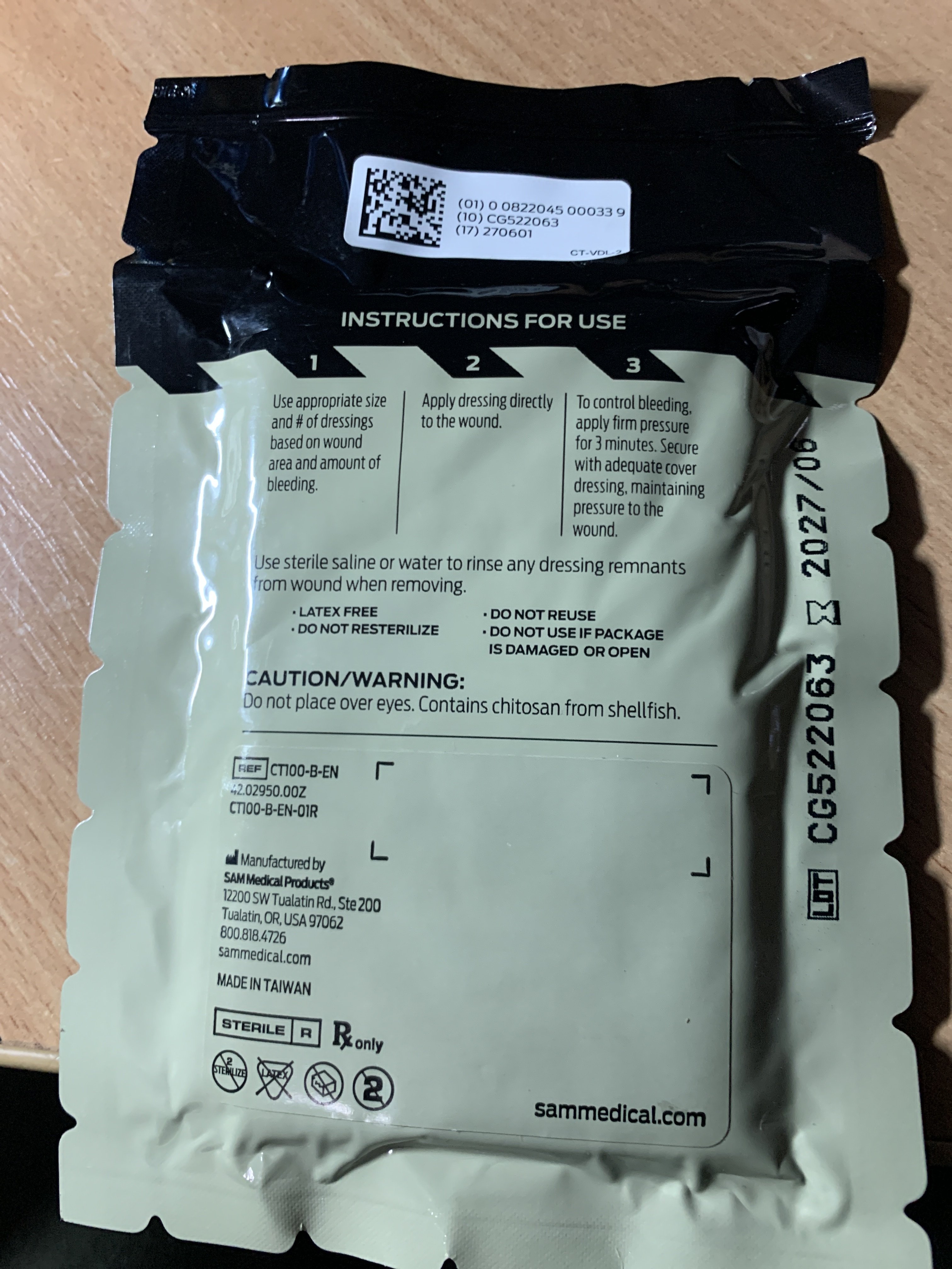 1).Оклюзійна пов'язка наліпка Rhino rescue, вентильована- 5 шт; -по 75грн. 2). Гемостатичний бинт Chito Sam 100- 1 шт. - 150 грн ( до 2027 року) 3) Кровоспас 7,5 см*3,6 м. - 2 шт. - по 70 грн. ( до 2028 року) 4). Кровоспас 7,5 см. *2 м. - 10 шт. ( прострочені до 2024 року) - по 20 грн.