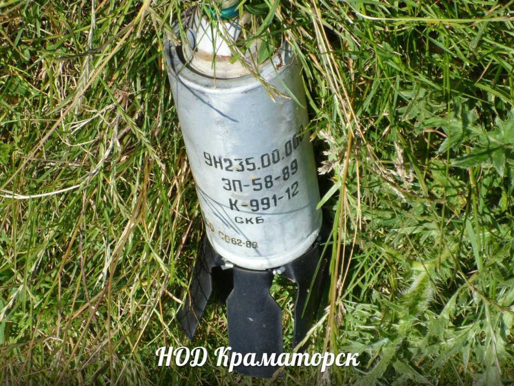 Вот А это уже осколочный суббоеприпас со "Смерча", кассетного снаряда 9М55К. Там их 72 штуки. С готовыми осколками. Очень опасная хрень. Стоит самоликвидатор ( должен срабатывать после 110 сек, после раскрытия снаряда). Но этот не сработал.